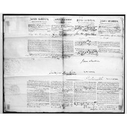 <b>158. JAMES MADISON</b> Partly-printed D.S. "<i>James Madison</i>" as President, 1p. folio, Washington, Nov. 4, 1809, a four-language ship's paper issued to the brig Regulator which was bound from New York to Lisbon with a cargo of flour, pork, pepper and staves. Partly-split vertical fold lightly toned, with three old tape repairs on verso on the same fold slightly showing through, balance of document is very good condition with a large, very bold signature. Floated on a mat and set in a gold frame. Unexamined out of frame.<b>$700-900</b>
