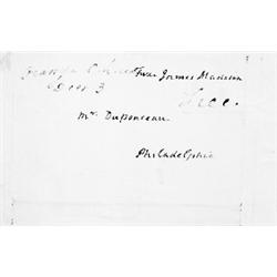 <b>159. JAMES MADISON</b> Front panel of a franked postal cover, signed "<i>Free James Madison</i>" at upper-right, and addressed in his hand to "<i>Mr. Duponceau Philadelphia</i>". The envelope was likely intended for Peter S. Duponceau who served as von Steuben secretary during the Revolutionary War, later popular among the well educated and active in Philadelphia politics. Fine condition, matted with an engraving and set into a gilt wood frame. Unexamined out of frame.<b>400-600</b>