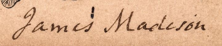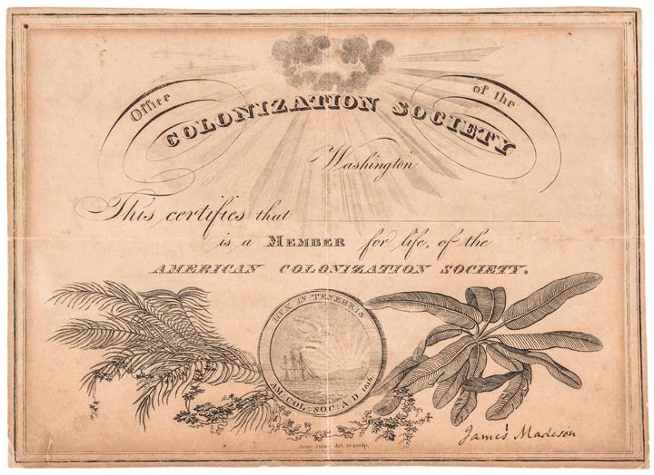 Extremely Rare and Important, Partially-Printed Document, Signed “James Madison,” at Washington (DC), 1 page, measuring 7” x 10.25”, no date, unaccomplished, Copper-Plate Engraved Decorative Membership Certificate, by “Henry Stone, sculp.” (in printed text at bottom center), Very Fine. An uncommon Membership Certificate, this uncompleted blank form being Signed in advance by the Society's President, “James Madison” conferring a Life Membership in the controversial American Colonization Society (officially known as the American Society for Colonizing the Free People of Color of the United States). Well printed in black on period wove paper that has been laid down on a slightly larger sheet for prior display, small .5” edge tear and corner tip replaced at the lower left, having overall even age tone, the signature “James Madison” is quite bold. This official Membership Certificate showing the sun's rays shining from the clouds, across which is the bold legend "Office of the COLONIZATION SOCIETY - Washington". The Society's circular emblem is shown in a central oval at bottom center, illustrating a vignette of a Ship Sailing to “LIBERIA” with Latin motto, "Lex in Tenebris" which translates as, “Light Amid Darkness.” The emblem is flanked by sheaves of banana and palm leaves. James Madison Signs in deep rich brown ink at lower right. According to the Library of Congress the selling Life Memberships was a standard fundraising practice. In 1825, at a price of Thirty Dollars per Membership Certificate, not less than Fifty Thousand Dollars was raised in this way.