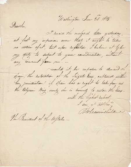 (1751 - 1836) Fourth President of the United States considered the "Father of the Constitution", he authored the Federalist Papers and sponsored the Bill of Rights. A.E on the docket of a good content A.L.S. of BENJAMIN W. CROWNSHIELD as Secretary of the Navy, 1p. 4to. Washington, June 25, 1816 forwarding correspondence on to Madison concerning the U.S.S. Essex, the American frigate captured by the British off Valpariso, Chile in 1814. Crownshield forwards the correspondence [no longer present] "wihtout any comment from me." However in the next paragraph, he proceeds to comment: "Would it be improper to demand of Spain, the restoration of the Frigate Essex, captured within her jurisdiction? If Spain has a right to take from us the Algerian Brig, surely she is bound to restore the Essex." The ship, was no longer in South America but had sailed back to England and was christened the HMS Essex. It served as prison ship in Ireland between 1824 and 1834. In 1837 the ship was sold at auction. On the docket, Madison has written, "B. W. Crownshield June 25 1816" Some marginal wear including tears and minor losses, else very good.