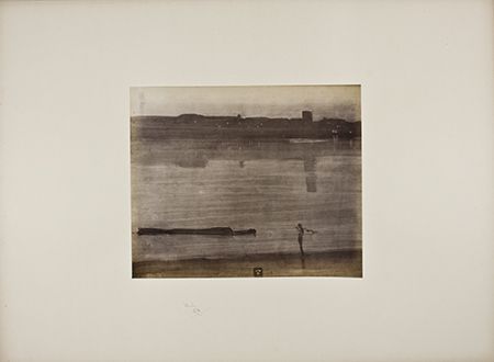 (1834 - 1903) American artist, a portrait painter with a pugnacious attitude best remembered for the portrait of his mother seated in a rocker. A superb Whistler piece, a signed photograph of his painting "Nocturne - Blue and Silver - Battersea Reach", 10" x 7" (with mat, 20" x 15"), showing a young lady in evening dress and coat regarding the viewer from over her shoulder. Very nicely signed beneath the image on mat in pencil "Whistler" and adding his ornate "butterfly" paraph. In near fine condition, ideal for framing.