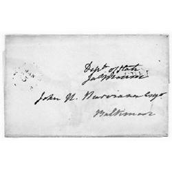 <b>842. JAMES MONROE</b> Folded postal cover franked by Monroe: "<i>Dept. of State Jas. Monroe</i>" and addressed by him to a gentleman in Baltimore. Light toning, else very good.<b> $300-400</b>