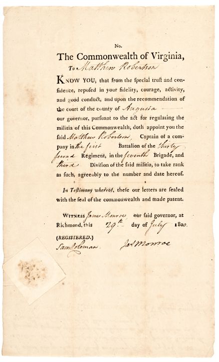 July 29, 1800-Dated Federal Period, original Partly-Printed Document Signed, “Jas Monroe” as Governor of Virginia, at Richmond (VA.), 1 page, measuring 13.25” x 8”, Very Fine. This being a very rare type Official Form, a Commission, Appointing Matthew Robertson a “Captain of a company in the First Battalion of the Thirty-Second Regiment, in the Seventh Brigade, and Third Division” of the Virginia Militia. Original laid period which has been folded for storage, its full official Paper and Wax Seal at lower left is fully intact. It is very well printed in black and remains clean overall with a very bold deep brown signature of James Monroe. Some original press text embossing remains within the paper and there is a short statement written upon the blank reverse. This is the very first of this historic Virginia Military form we have offered and looks quite impressive for display. It reads, in full: