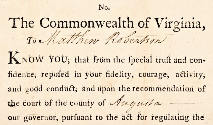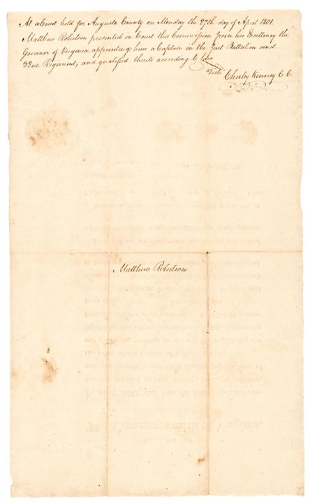 “At a Court held for Augusta County on Monday the 27th day of April 1801. Matthew Robertson presented in Court this Commission from his Excellency the Governor of Virginia, appointing him a Captain in the First Battalion and 32nd Regiment, and qualified thereto according to law. -- (Signed) Chesly Kinney, C.C. (Count Clerk). Also Signed on the lower central panel, “Matthew Robertson.”
