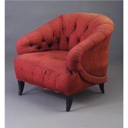 JAMES MONT lounge chair upholstered in its original tufted red fabric, with black lacquered sabre legs. Bent springs to front of chair, wear and stains to upholstery. Consigned by original owner. Unmarked. 29" x 29 1/2" x 29 1/2" $800 - 1,200