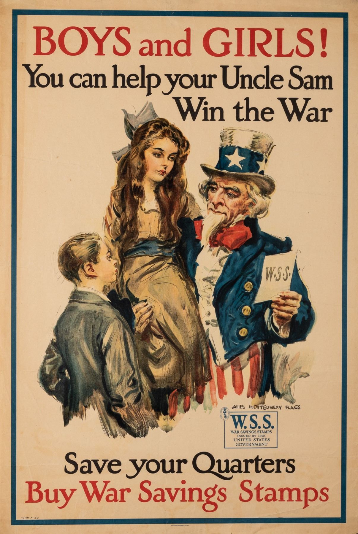 James Montgomery Flagg (1877-1960) 'Boys and Girls! You can help your Uncle Sam Win the War - Save your Quarters Buy War Savings Stamps', War Saving Stamps, American Lithographic, Co., N.Y., 1917, 20 x 30 inches. Minor tears at edges, minimal folds.