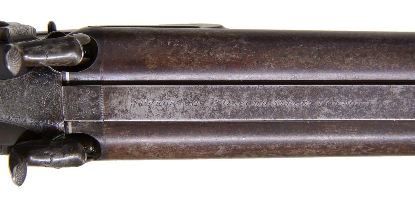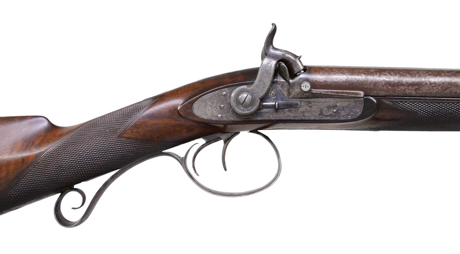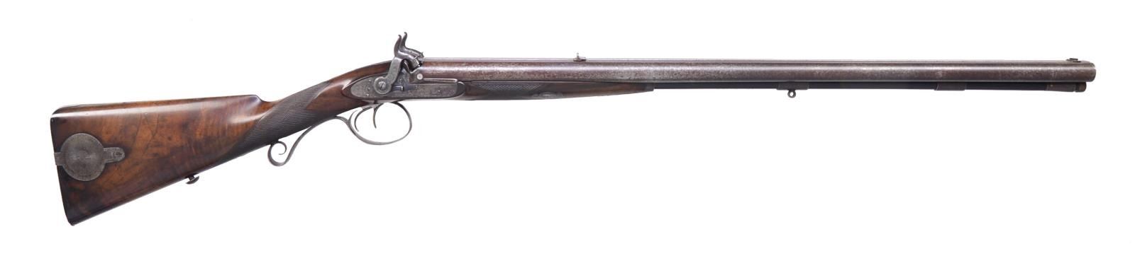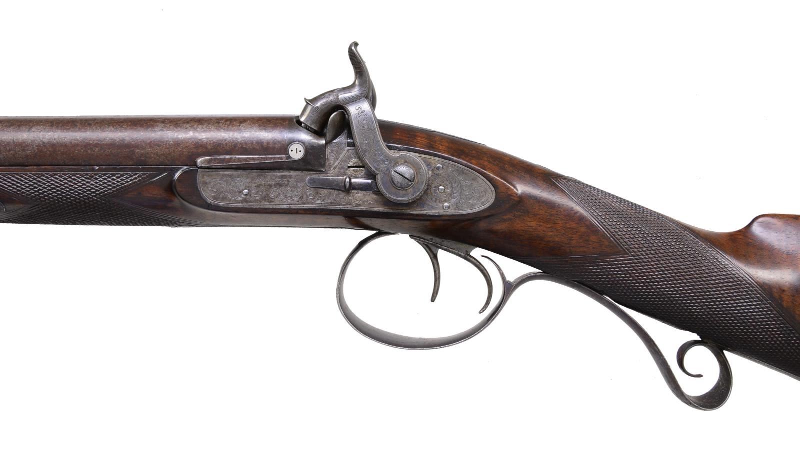 MAHOGANY CASE & ACCESSORIES. Cal. 16 Bore. S# 3436. Bbl. 29". Patrick Unsworth in the "EARLY PURDEYS" indicates that this rifle was sold 24 June, 1841. It was a 16 bore dbl. rifle w/ 29" bbls. & was not known to be extant at the time his book was published. Price is not listed, but similar rifles sold for £84. The rifle does fit all those criteria, the 29" damascus bbls. w/ 10 groove rifling (approx. 1 turn in 40") are engraved "J. Purdey, 314 1/2 Oxford Street, London." on broad flat rib. A 1 standing 1 folding leaf express rear sight is dovetailed through, as is sm. steel bead front sight. Bottoms of bbls. are stamped w/ London black powder proofs, S#s & bbl. makers initials J.P. (James Purdey). Original ebony ramrod w/ grooved brass tip & tail is numbered on tail. Ramrod is held by two plain pipes (sling eye on rear pipe). Patent breeches have scroll engraved rib extension, platinum bands at rear & triple vented platinum plugs. What appear to be original nipples are marked "R" & "L". S#s are on hooks. Breech iron is case hardened & fully engraved w/ very well cut shaded scroll. Locks w/ 2nd type broad flat faced, chamfered hammers are engraved w/ open scroll. Hammers have matching open scroll on neck & stylized dolphin heads. Locks are fitted w/ blued front sliding safeties. Trigger plate is a reinforcing type w/ ball shaped finial & reinforcing screw through ramrod channel. Trigger guard has scrolled grip. Bow is engraved w/ shield & two birds w/ ball of grip & tail w/ scroll. Stock of dense stump figured & lightly marbled European walnut measures 14 1/2" over checkered steel buttplate w/ long scroll engraved top spur. There is a spring-loaded patchbox on right side of butt engraved w/ central flower surrounded by feather burst. Square flat top checkering is at grip & forend. Stock also has sm. beaded shadowline right hand cheekpiece. Thimble has stylized pineapple finial. A steel sling button is on toeline & there is a steel lined hole at top of grip to receive lollipop type rear sight (not present). Stock attaches to bbls. w/ captive sliding side bolt through shaped & engraved steel escutcheons. UNATTACHED ACCESSORIES: rifle is housed in a period "plum pudding" figured mahogany case w/ inlet shaped brass corners, folding D ring handle & dual pivoting brass hook closure. Case is lined in royal blue velvet. Bottom compartment partitions are topped w/ oak. Rifle fits case almost perfectly, but no Purdey label is present. Case contains "WD" (William Davis) marked brass bullet mold for short conical .645 bullet w/ hollowed base for paper patch, another steel "13" marked mold for .728 diameter rnd. ball, brass & ebony 3 piece cleaning rod, fluted copper bodied powder flask by Dixon throwing a charge of up to 3 drams, ebony handled nipple wrench w/ pricker in handle, bone nipple bottle, aluminum oil bottle by Dixon, 2 lignum vitae handled bullet starters, tin of 4 Walkers percussion caps holding wads & bullet worm that screws into tip of ramrod. CONDITION: very good to fine. Bbls. retain most of their original brown pattern, thinned on sides w/ a fair amount of dark oxidation. Breech iron & locks retain most of their original case hardening color w/ some scattered pitting mostly at front of right lock which is fairly deep. Safeties retain most of their bright blue. Trigger guard retains perhaps 20% of its original blue, most loss due to flaking. Buttplate is all gray. There is some case hardening color on patchbox cover. Stocks retain nearly all of an old oil refinish over some scattered marks & w/ a few subsequent. Sharp edges somewhat softened. It appears checkering was cleaned at the same time & has light subsequent wear. Bores are very fine, sharp rifling throughout, shiny, but w/ some scattered pits toward muzzles. Locks are crisp & safeties work. Exterior of case retains 80% of what appears to be a very old refinish & w/ subsequent scratches. Retaining loops for keylock are broken off. Interior cloth is very good to fine w/ some marks in lid from contact w/ bbls. & a few cuts where it appears a label was removed. Interior partitions are good & do not appear to have been moved. Accessories are very good to fine. A lovely old rifle by London's most celebrated 19th & 20th century maker. (01-18137/MGM30). ANTIQUE. $6,000-9,500.