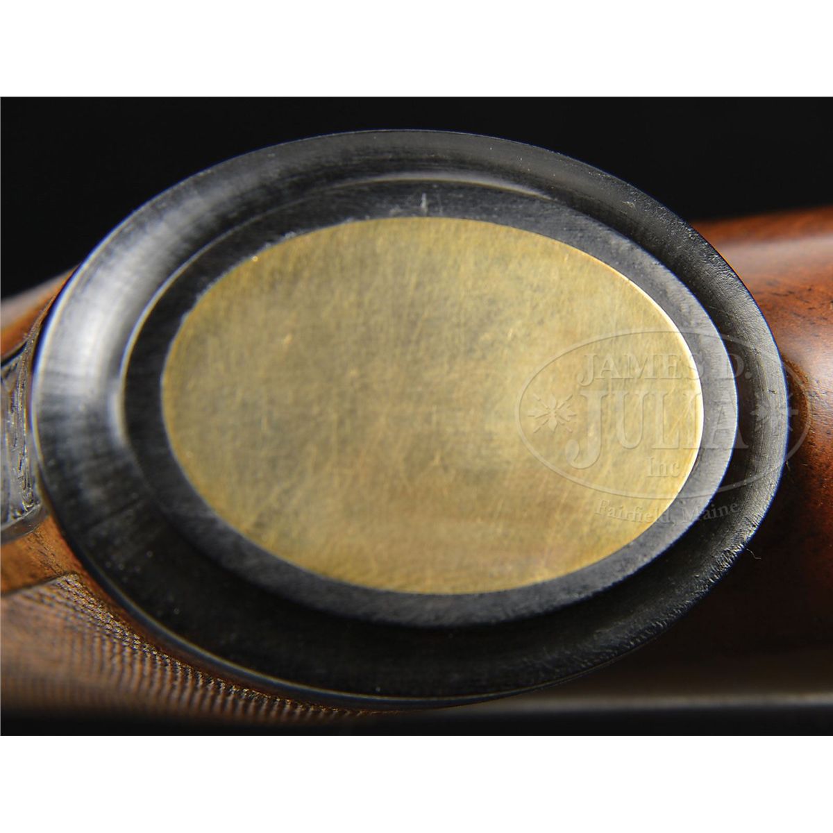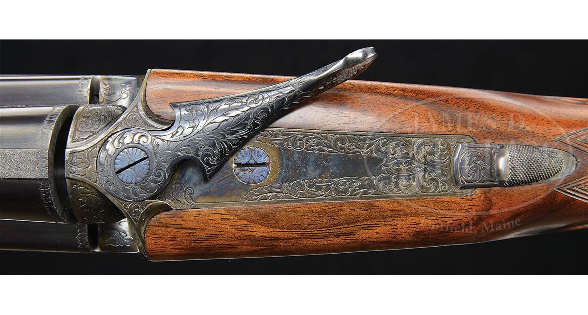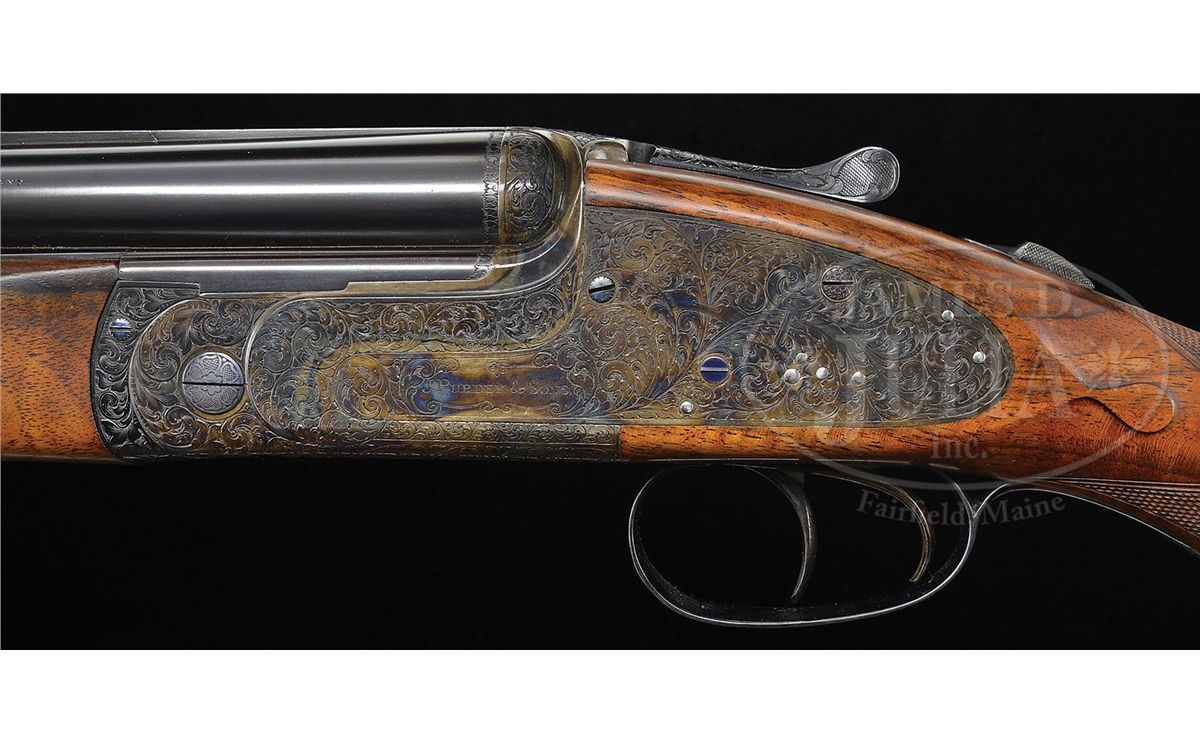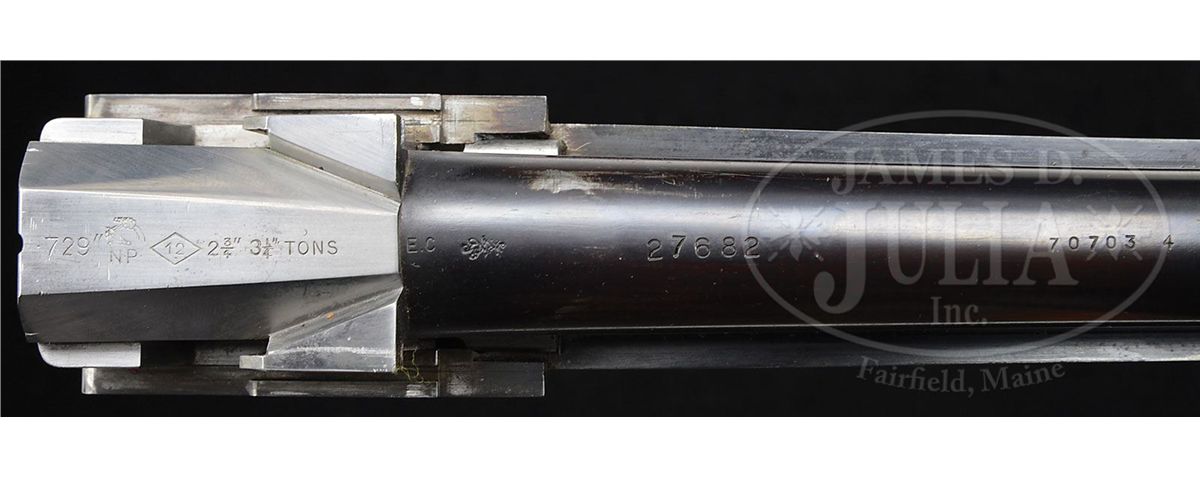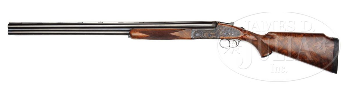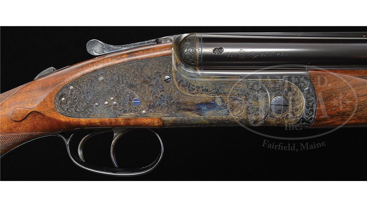 SN 27682. (1969) Cal. 12 ga. 2-3/4" Chambers. 28" Demi-bloc bbls with narrow, matted, ventilated rib mounted with two ivory beads, are engraved "J. Purdey & Sons. Audley House. South Audley Street. London. England." on left side of top bbl. Right side of top bbl and flat of bottom bbl are stamped with London nitro proofs for 2-3/4" chambers. Bottom of bottom bbl is stamped with SN, tube nos. "70703 4", and bbl makers initials "EC" (Ted Comben). Case hardened, low profile, O/U action features non-automatic safety (SAFE inlaid in gold), rounded bar, raised rib tumbler end cocking indicators, and double triggers. Action and lockplates are engraved with exceptionally well cut and shaded, large, scrolled acanthus with strap work highlights, a pattern often used by noted engraver Ken Hunt. The quality of execution of this engraving would lead one to believe that indeed he was the engraver, however no signature can be found. "J. Purdey & Sons" is in scroll framed cartouche on each lockplate, as well as on bottom of action above cut for forend iron, where it is over "London. England." Single beaded trigger guard has matching scroll, and SN on tang, which extends to composition grip cap inset with vacant large gold oval. Nicely stump figured and lightly marbled European walnut full capped pistol grip buttstock measures 14-5/8" over dark brown leather covered pad. Stock features Monte Carlo comb, drop points, point pattern checkering with mullered borders, and "H H" individually inlet in gold on toe line. One piece matching beavertail ejector forend has Anson release and actioner's initials "H B" on iron. Bore diameter: top -.731, bottom -.731. Bore restrictions: top -.042 (Extra Full), bottom -.009 (IC). Wall thickness: top-.032, bottom -.030. Drop at heel: 2-3/8", rear of Monte Carlo: 1-11/16", drop at comb: 1-1/2". Weight: 7 lbs. 12 oz. LOP: 14-5/8". Makers leather motor case with stitched leather corners is gold embossed on top "Hugh Halff Jr." Interior is lined in burgundy cloth with small gold embossed black leather Purdey label, and paper charge card for this gun, on lid. Case contains 2-pc beechwood and brass cleaning rod with red morocco leather wallet containing brush, mop, and jag, another leather wallet with two action cleaning brushes, and another red morocco container with a pair of Purdey marked snap caps, a black leatherite wallet with a pull through cleaning kit, an unmarked striker bottle with spare strikers, 12 ga. broken case extractor, and an unmarked square oil bottle. CONDITION: Excellent, near new, with only a few light handling marks in wood or metal. Leather on toe of recoil pad is somewhat scuffed. Bores are excellent. Mechanically crisp. Case leather has a few minor marks and scuffs. Straps and handle are very fine. Interior cloth is excellent, with some light compressions. Labels are excellent. Accessories are excellent. 4-49355 MGM244