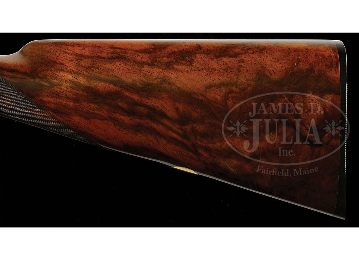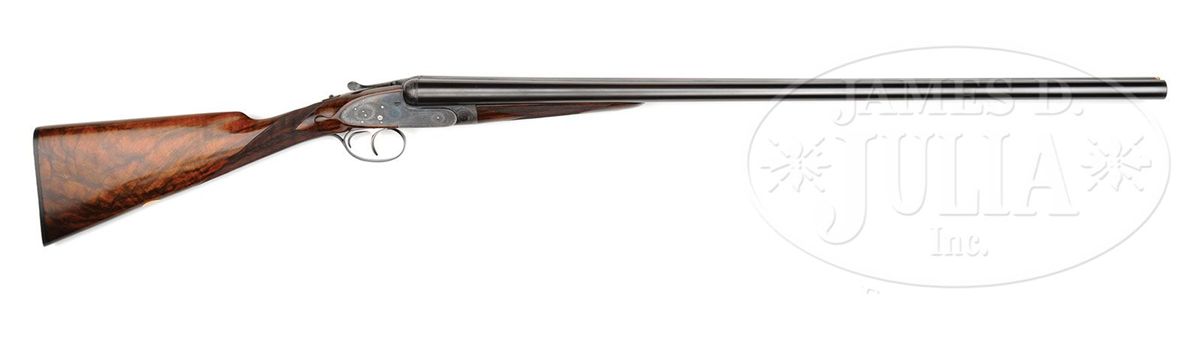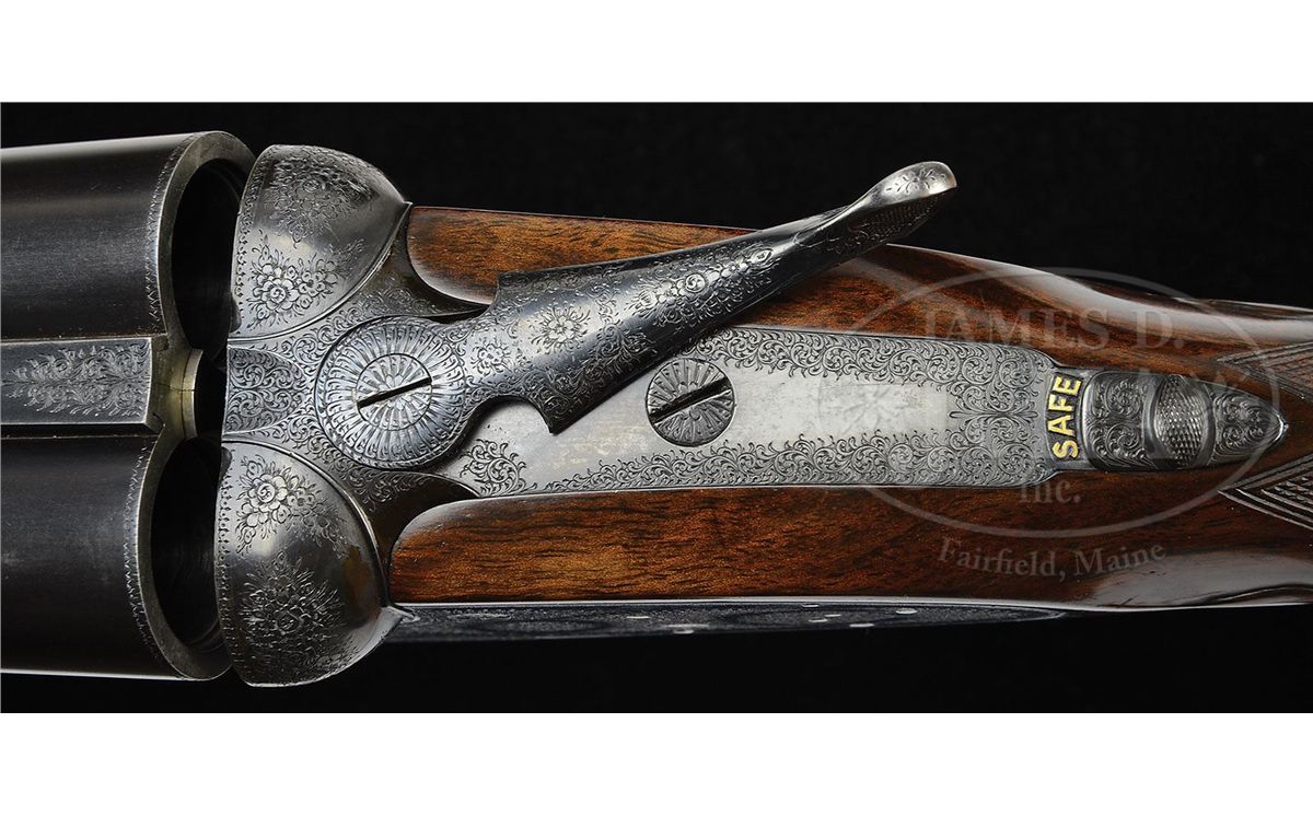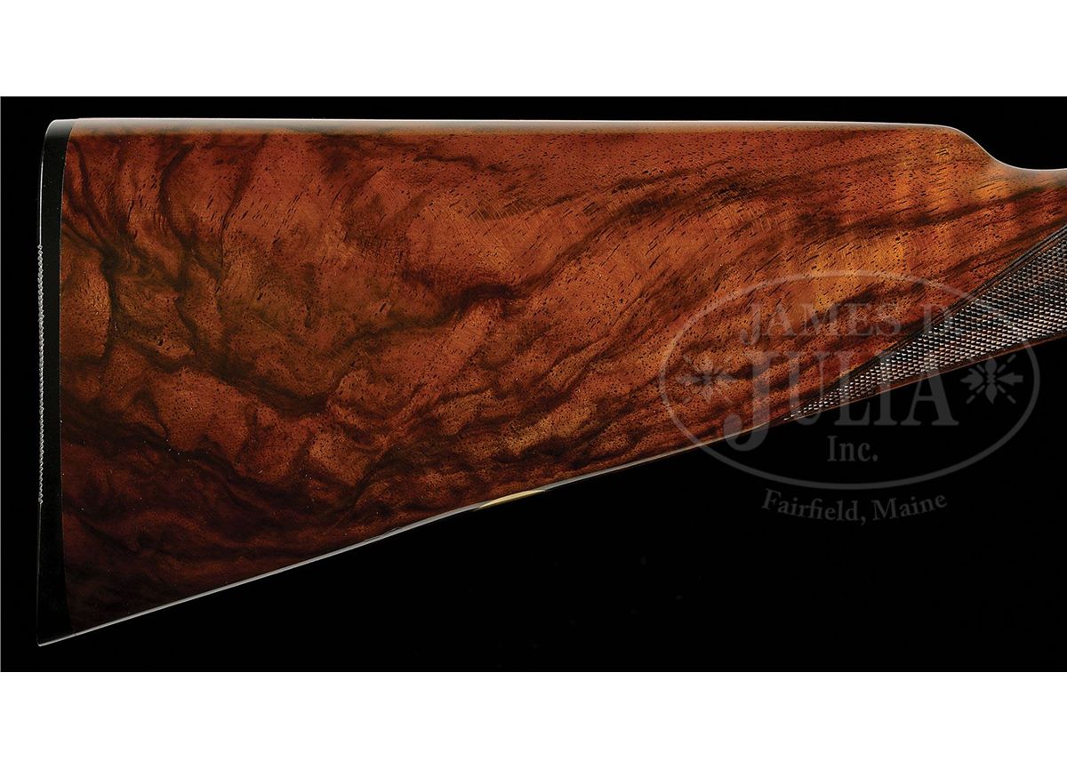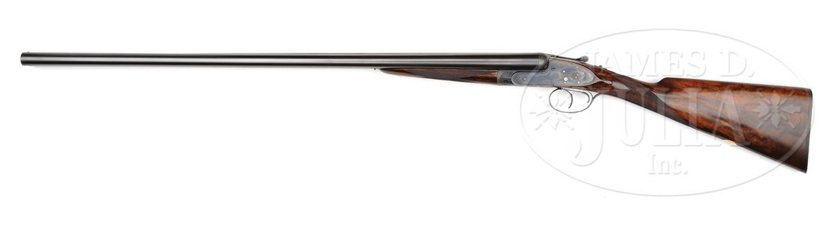 SN 15238. (1895) Cal. 12 ga. 2-3/4" Chambers. 30-1/2" (consignor letter states factory records indicated that gun had 30-1/4" bbls, so 30-1/2" is the original length) chopper lump bbls with narrow game rib engraved "J. Purdey & Sons. Audley House. South Audley Street. London." and "Made of Sir Joseph Whitworth's Fluid-Pressed Steel". Bbl flats are stamped with London nitro proofs for 1-1/4 oz of shot (2-3/4"). Bottoms of bbls are stamped with SN, left bbl with bbl makers initials, "SS" (Sam Simons). Tube nos. "15622" and "15621" are on loop. Typical Beesley patent, sidelock, self-opening action has been blued and features automatic safety (SAFE inlaid in gold), bushed strikers, engraved arrowhead tumbler end cocking indicators, and double triggers. Action and lockplates are engraved with fine, well cut scroll and rose bouquet highlights in Purdey "house" style, as originated by and in this case probably executed by, long time head engraver J. Lucas. "J. Purdey & Sons" is engraved on each lockplate. Bottom of action is engraved "Purdey's Patent". Exceptionally well figured and mottled Circassian walnut straight grip buttstock measures 14" over ribbed, hard rubber buttplate, and features drop points, point pattern checkering with mullered borders, and a vacant gold oval on toe line. Matching splinter ejector forend has Anson release. Inside of iron is engraved "3" ("3" is also stamped on bridge of water table, but nowhere on bbls) and stamped with actioners initial "H" (Fred Hughes). Bore diameter: left-.733, right -.733. Bore restrictions: left -.008 (IC), right -.000 (Cyl). Wall thickness: left -.030, right -.030. Drop at heel: 2-1/16", drop at comb: 1-3/8". Weight: 6 lbs. 14 oz. LOP: 14". PROVENANCE: Previous owners letter stating that he went to Purdey's and read the order book, and that this gun was one of three made for Lord Tweedmouth; has special order wood; and 30-1/4" bbls, with "game boring". Letter from Purdey's regarding the disposition of this gun. Biographical information and political history of Edward Marjoribanks, Second Baron Tweedmouth, 1849 - 1909. CONDITION: Excellent, as refinished. Bbls retain essentially all of a fine satin re-blue, engraving on rib remains sharp. Action blued, and retains 85 - 90% of that blue, silvered on beads and bottom. Engraving is sharp and clear. Stocks retain nearly all of a glossy finish, edges slightly rounded, checkering re-cut. Bores are excellent, smooth, bright, and shiny. Action is tight. Bbls are slightly off face. Ejectors are in time. 4-48836 MGM37