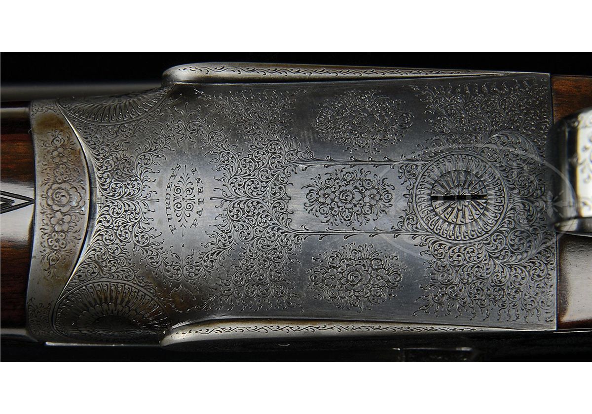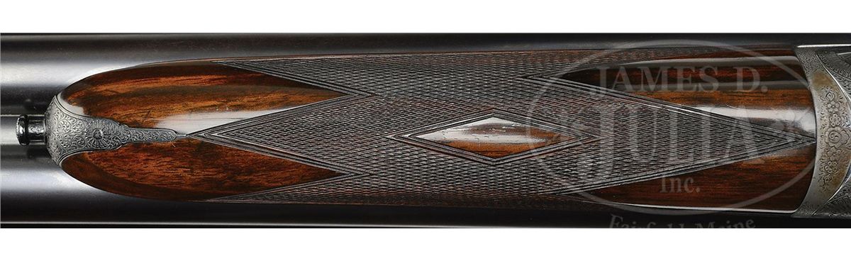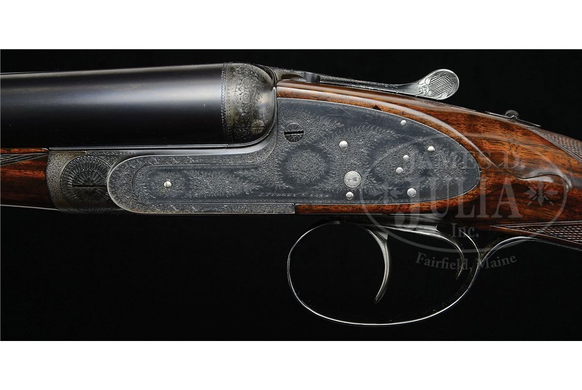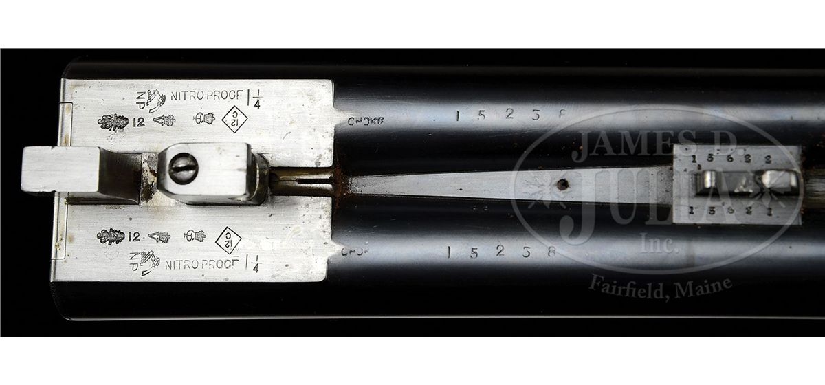 SN 15238. (1895) Cal. 12 ga. 2-3/4" Chambers. 30-1/2" (consignor letter states factory records indicated that gun had 30-1/4" bbls, so 30-1/2" is the original length) chopper lump bbls with narrow game rib engraved "J. Purdey & Sons. Audley House. South Audley Street. London." and "Made of Sir Joseph Whitworth's Fluid-Pressed Steel". Bbl flats are stamped with London nitro proofs for 1-1/4 oz of shot (2-3/4"). Bottoms of bbls are stamped with SN, left bbl with bbl makers initials, "SS" (Sam Simons). Tube nos. "15622" and "15621" are on loop. Typical Beesley patent, sidelock, self-opening action has been blued and features automatic safety (SAFE inlaid in gold), bushed strikers, engraved arrowhead tumbler end cocking indicators, and double triggers. Action and lockplates are engraved with fine, well cut scroll and rose bouquet highlights in Purdey "house" style, as originated by and in this case probably executed by, long time head engraver J. Lucas. "J. Purdey & Sons" is engraved on each lockplate. Bottom of action is engraved "Purdey's Patent". Exceptionally well figured and mottled Circassian walnut straight grip buttstock measures 14" over ribbed, hard rubber buttplate, and features drop points, point pattern checkering with mullered borders, and a vacant gold oval on toe line. Matching splinter ejector forend has Anson release. Inside of iron is engraved "3" ("3" is also stamped on bridge of water table, but nowhere on bbls) and stamped with actioners initial "H" (Fred Hughes). Bore diameter: left-.733, right -.733. Bore restrictions: left -.008 (IC), right -.000 (Cyl). Wall thickness: left -.030, right -.030. Drop at heel: 2-1/16", drop at comb: 1-3/8". Weight: 6 lbs. 14 oz. LOP: 14". PROVENANCE: Previous owners letter stating that he went to Purdey's and read the order book, and that this gun was one of three made for Lord Tweedmouth; has special order wood; and 30-1/4" bbls, with "game boring". Letter from Purdey's regarding the disposition of this gun. Biographical information and political history of Edward Marjoribanks, Second Baron Tweedmouth, 1849 - 1909. CONDITION: Excellent, as refinished. Bbls retain essentially all of a fine satin re-blue, engraving on rib remains sharp. Action blued, and retains 85 - 90% of that blue, silvered on beads and bottom. Engraving is sharp and clear. Stocks retain nearly all of a glossy finish, edges slightly rounded, checkering re-cut. Bores are excellent, smooth, bright, and shiny. Action is tight. Bbls are slightly off face. Ejectors are in time. 4-48836 MGM37