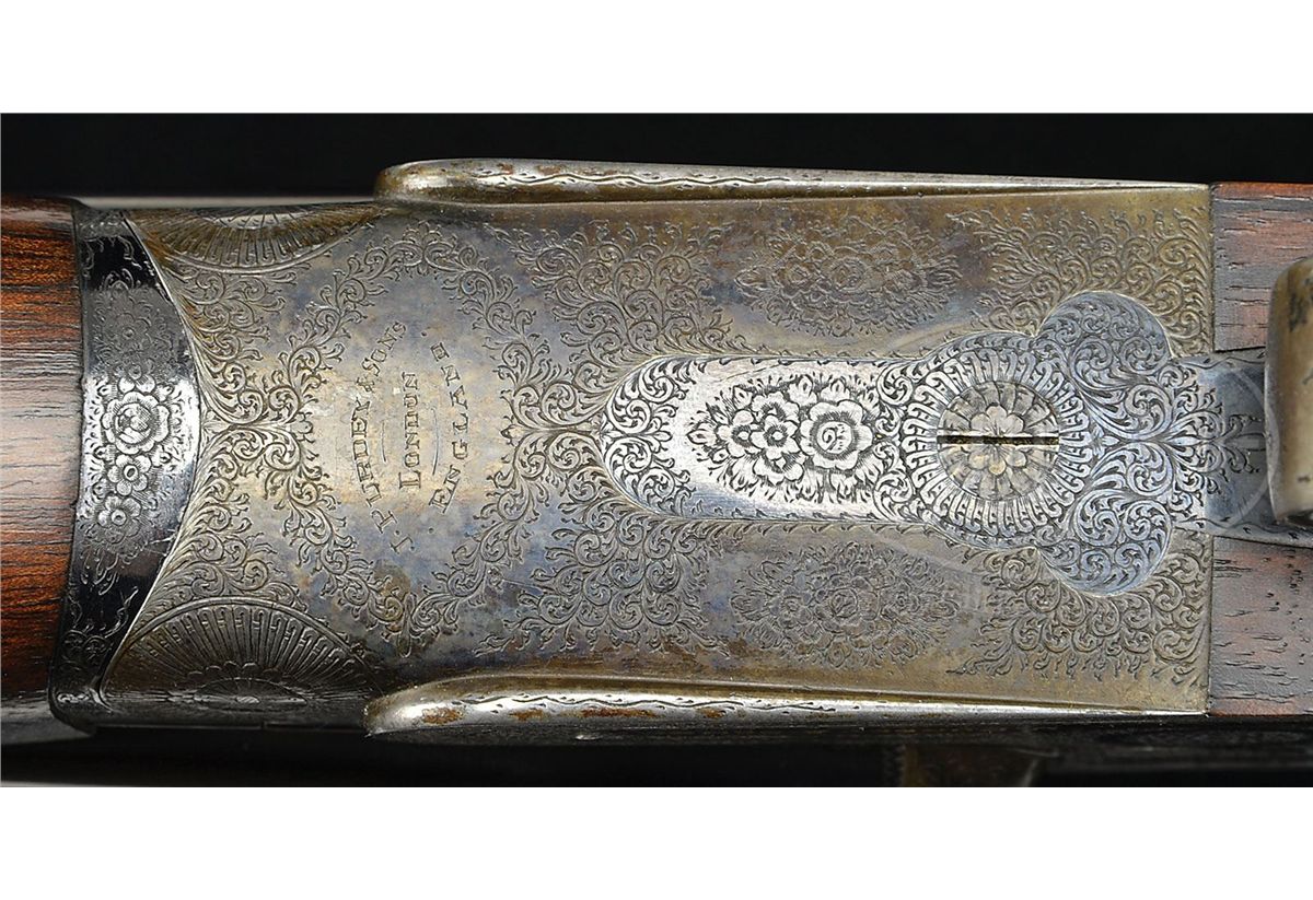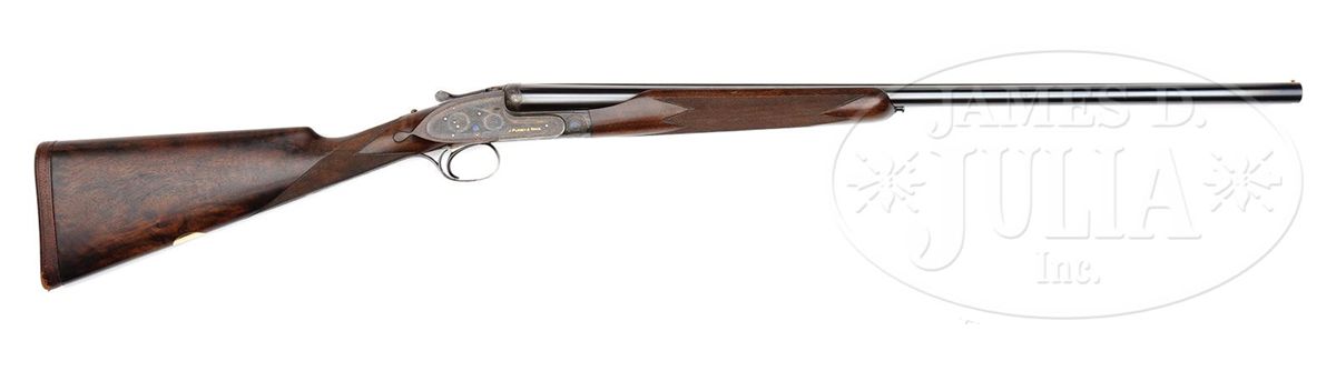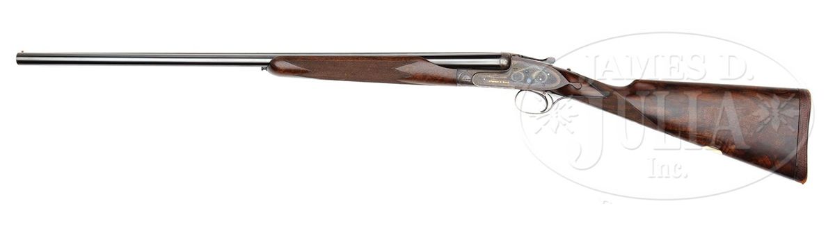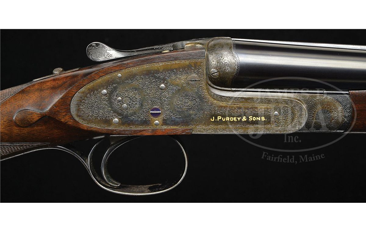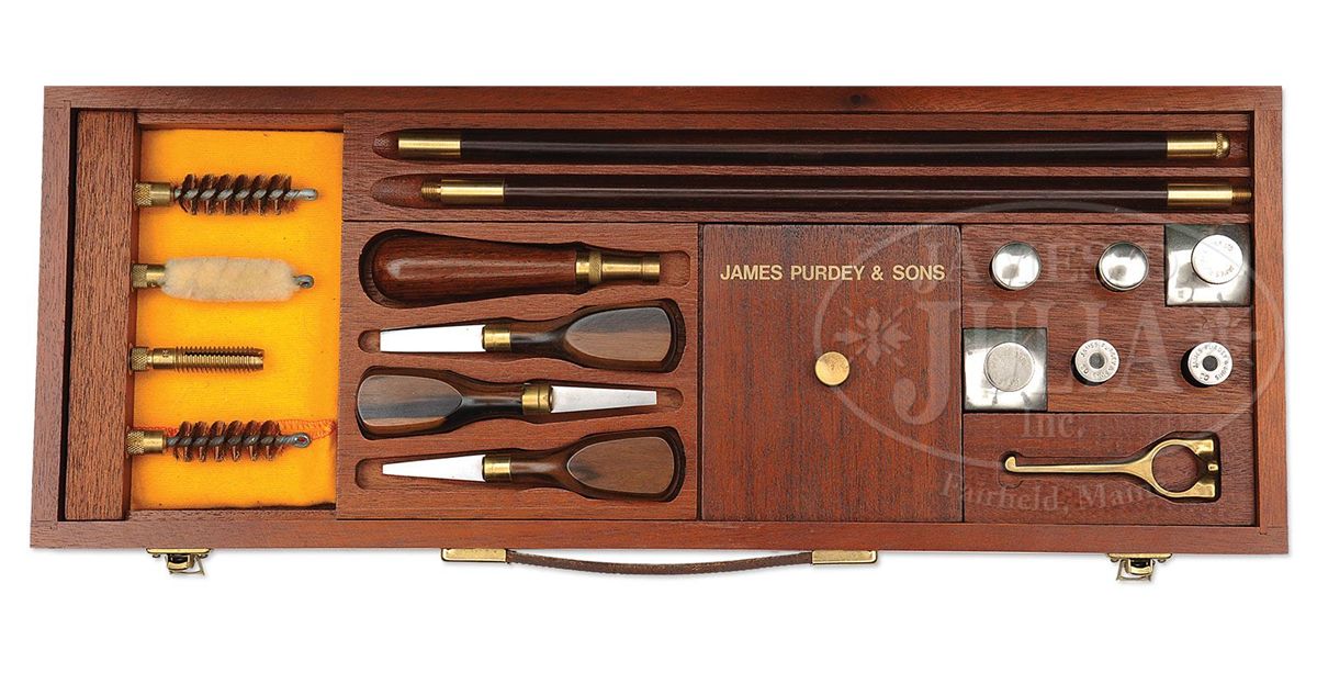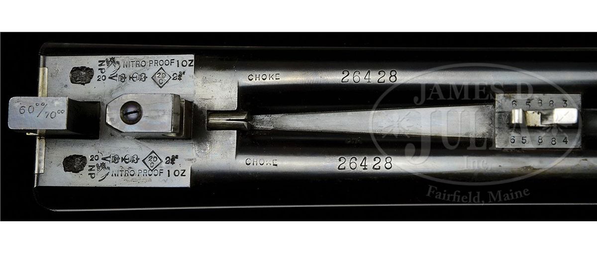 SN 26428. (1953) Cal. 20 ga. 2-3/4" Chambers. 26" Chopper lump bbls with raised, narrow, matted rib, are engraved "J Purdey & Sons." and "Audley House South Audley Street London. England." on tops. Bottoms of bbls are stamped with London nitro proofs for 20 ga. 1 oz of shot, and "2-3/4". Bottoms of bbls are each stamped "Choke" and with SNs. Bbl makers initials "J.A" (J. Aldous) are on left bbl. Tube nos. "65883" and "65884" are on loop. Case hardened, Beesley patent, self-opening, sidelock action features hidden third fastener, side clips, bushed strikers, raised rib tumbler end cocking indicators, non-automatic safety (SAFE inlaid in gold), and Purdey non-selective single trigger. Action and lockplates are engraved in very well cut, small, shaded scroll with rose bouquet highlights in Purdey house style, most probably the work of Ken Hunt who was working exclusively for Purdey's at the time of manufacture of this gun. "J. Purdey & Sons" is inlaid in flush gold at the front of each lockplate, and engraved on bottom of action with the addition of "London England". Small bow trigger guard is engraved with classic open scroll, and with SN at grip. Dark, well fiddle figured, and nicely marbled European walnut straight grip buttstock measures 14" over thin, reddish, leather-covered pad, and features classic point pattern checkering with mullered borders, drop points, and a large vacant gold oval on toe line. Large beavertail ejector forend has Anson release, and actioners initials "B.D" (Ben Delay) are stamped on iron. Bore diameter: left-.615, right -.615. Bore restrictions: left -.025 (I Mod), right -.010 (IC). Wall thickness: left -.032, right -.031. Drop at heel: 1-15/16", drop at comb: 1-7/16". Weight: 6 lbs. 1 oz. LOP: 14". Also included is a Purdey mahogany cased cleaning kit, with leather strap handle. Interior is lined in green felt, with small gold embossed Purdey label, containing an array of accessories and cleaning equipment, including 3-pc rosewood and brass cleaning rod, with two brushes, mop, and jag, three unmarked walnut handled turnscrews, two Purdey marked oil bottles, two unmarked striker cases, an unmarked 20 ga stuck case remover, and a pair of Purdey marked 20 bore snap caps, and some cleaning patches, under removable cover with brass knob, marked "James Purdey & Sons". CONDITION: Excellent. Bbls retain approx 98% orig blue, with a few marks on sides from contact with forend. Action retains 95% orig case hardening color, silvered slightly on beads and fences. Lockplates retain nearly all of their color and original varnish, which has considerably darkened and should be refreshed. Trigger guard is flaking to silver on bow, and has wear at grip. There is some oxidation inside of bow from finger contact. Stock retains most of its orig finish with a number of minor scratches and marks. Leather of recoil pad is beginning to rub and wear through at heel and toe. Bores are excellent, bright and shiny throughout. Action is tight. Bbls are on face. Ejectors are slightly out of time. Cleaning kit is excellent, some scratches and loss to veneer on cover, accessories, etc. unused. This fine gun, obviously made by long term Purdey gunmakers, is in need of a good cleaning. 4-48989 MGM63