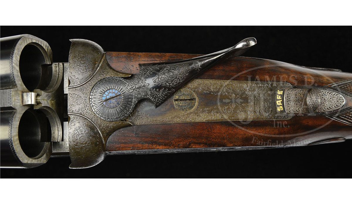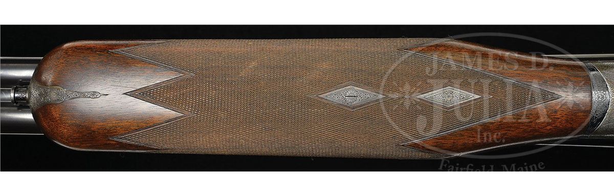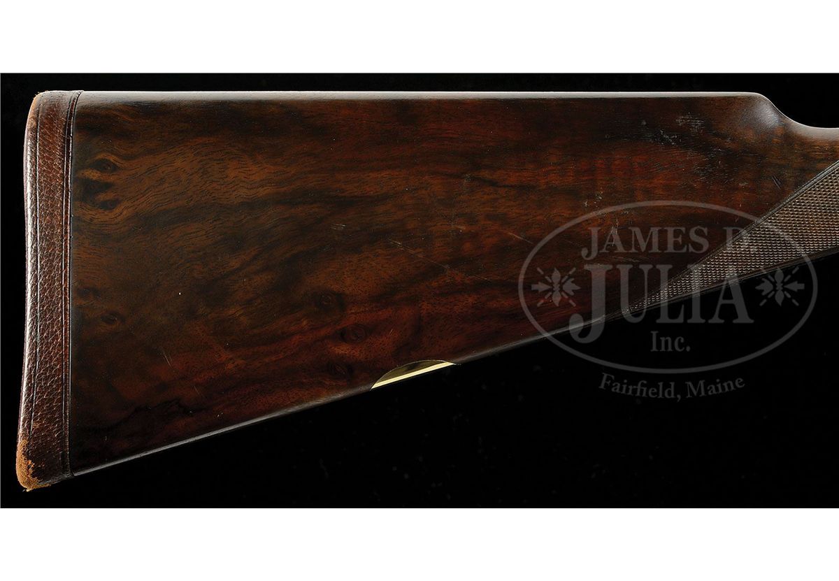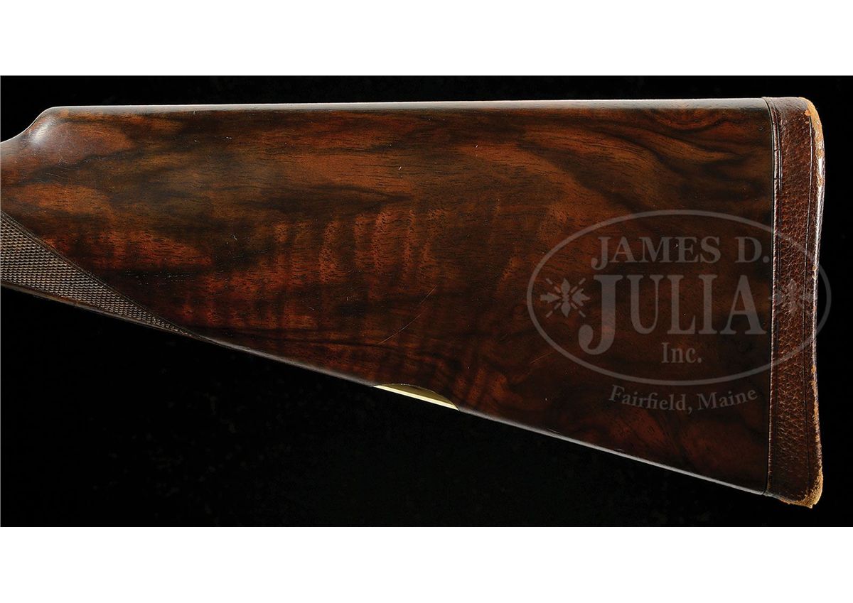 SN 26428. (1953) Cal. 20 ga. 2-3/4" Chambers. 26" Chopper lump bbls with raised, narrow, matted rib, are engraved "J Purdey & Sons." and "Audley House South Audley Street London. England." on tops. Bottoms of bbls are stamped with London nitro proofs for 20 ga. 1 oz of shot, and "2-3/4". Bottoms of bbls are each stamped "Choke" and with SNs. Bbl makers initials "J.A" (J. Aldous) are on left bbl. Tube nos. "65883" and "65884" are on loop. Case hardened, Beesley patent, self-opening, sidelock action features hidden third fastener, side clips, bushed strikers, raised rib tumbler end cocking indicators, non-automatic safety (SAFE inlaid in gold), and Purdey non-selective single trigger. Action and lockplates are engraved in very well cut, small, shaded scroll with rose bouquet highlights in Purdey house style, most probably the work of Ken Hunt who was working exclusively for Purdey's at the time of manufacture of this gun. "J. Purdey & Sons" is inlaid in flush gold at the front of each lockplate, and engraved on bottom of action with the addition of "London England". Small bow trigger guard is engraved with classic open scroll, and with SN at grip. Dark, well fiddle figured, and nicely marbled European walnut straight grip buttstock measures 14" over thin, reddish, leather-covered pad, and features classic point pattern checkering with mullered borders, drop points, and a large vacant gold oval on toe line. Large beavertail ejector forend has Anson release, and actioners initials "B.D" (Ben Delay) are stamped on iron. Bore diameter: left-.615, right -.615. Bore restrictions: left -.025 (I Mod), right -.010 (IC). Wall thickness: left -.032, right -.031. Drop at heel: 1-15/16", drop at comb: 1-7/16". Weight: 6 lbs. 1 oz. LOP: 14". Also included is a Purdey mahogany cased cleaning kit, with leather strap handle. Interior is lined in green felt, with small gold embossed Purdey label, containing an array of accessories and cleaning equipment, including 3-pc rosewood and brass cleaning rod, with two brushes, mop, and jag, three unmarked walnut handled turnscrews, two Purdey marked oil bottles, two unmarked striker cases, an unmarked 20 ga stuck case remover, and a pair of Purdey marked 20 bore snap caps, and some cleaning patches, under removable cover with brass knob, marked "James Purdey & Sons". CONDITION: Excellent. Bbls retain approx 98% orig blue, with a few marks on sides from contact with forend. Action retains 95% orig case hardening color, silvered slightly on beads and fences. Lockplates retain nearly all of their color and original varnish, which has considerably darkened and should be refreshed. Trigger guard is flaking to silver on bow, and has wear at grip. There is some oxidation inside of bow from finger contact. Stock retains most of its orig finish with a number of minor scratches and marks. Leather of recoil pad is beginning to rub and wear through at heel and toe. Bores are excellent, bright and shiny throughout. Action is tight. Bbls are on face. Ejectors are slightly out of time. Cleaning kit is excellent, some scratches and loss to veneer on cover, accessories, etc. unused. This fine gun, obviously made by long term Purdey gunmakers, is in need of a good cleaning. 4-48989 MGM63