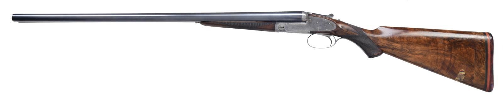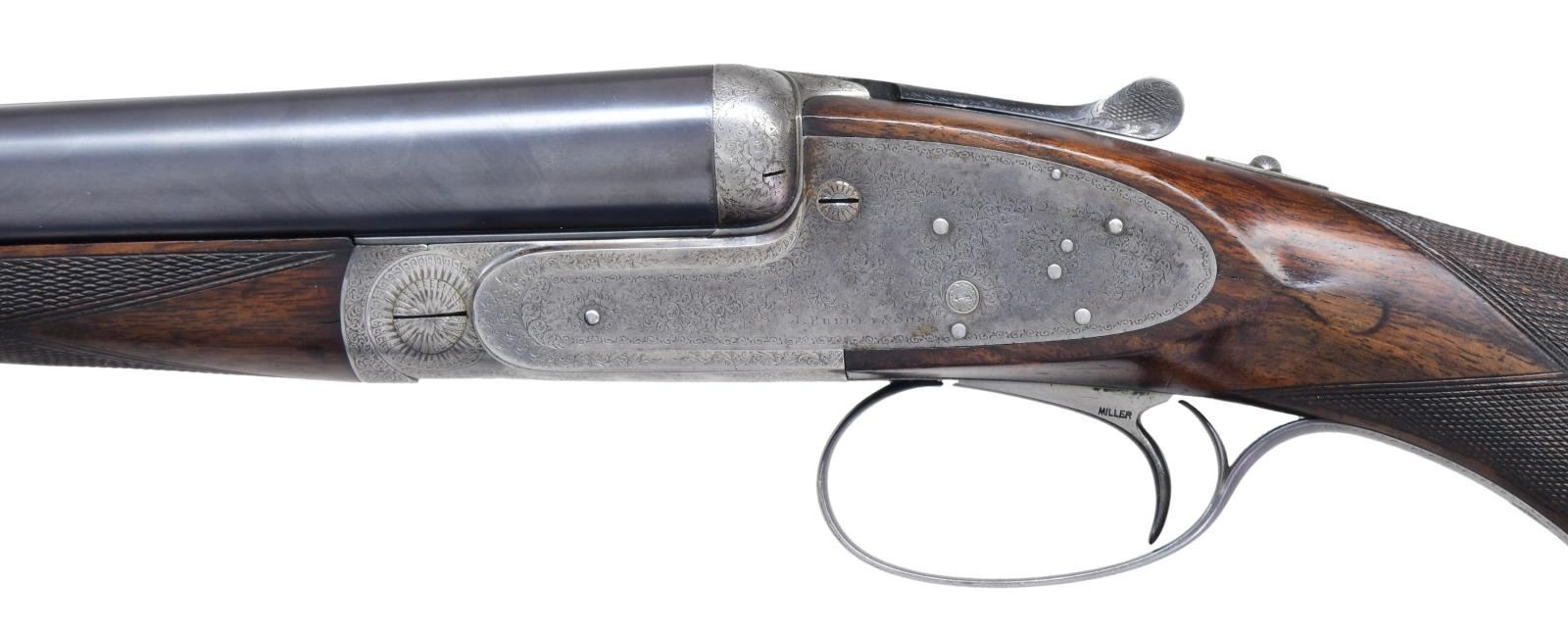 LIGHT GAME GUN. Cal. 12 Ga., 2 3/4". S# 18559. (CA 1905). The 28" chopper lump barrels are engraved with Purdey's Audley House address and Whitworth steel info on narrow game rib, rear portion of rib is engraved "1" which matches "1" on top lever and forend iron. Barrel flats are stamped with London nitro proofs for 2 1/2" chambers. Bottoms of barrels are stamped with S#s. Bottom of left barrel is stamped "CHOKE" and with barrel maker's initals "S.S." (Sam Simons). Tube numbers "32297 & 98" are on loop. Case hardened Beesley patent self-opening sidelock action features non-automatic safety ("SAFE" inlaid in gold), bushed strikers, engraved arrow tumbler end cocking indicators and Miller single trigger. Action and lockplates are engraved in Purdey house style rose and scroll, lockplates are engraved "J. Purdey & Sons". Bottom of action is engraved "Purdey's Patent". Trigger guard with scroll on bow has S# on tang which extends to small horn grip cap. Pistol grip buttstock of nicely marbled and well figured European walnut measures 15 3/8" over brown leather covered Silver pad over 1" figured wood extension (original wood measures 13 1/2"). Stock features drop points, point pattern checkering and vacant silver oval. Matching splinter Wem ejector forend has Anson release. MEASUREMENTS: BBLS: Bore Diameter: L .734. R .736. RESTRICTION L .032 (full). R .004 (IC). Wall thickness L .026. R .024. STOCK: DAH: 1 15/16". DAC: 1 3/8". CAST: approx 1/2" off. LOP: 15 3/8". WEIGHT: 6 lb. 14 oz. CONDITION: very good, barrels retaining nearly all of a good quality reblue, engraving is somewhat softened, action and lockplates retain about 30% original case hardening color fading to silver and gray. Engraving remains clear. Trigger guard and top lever retain most of their reblue. Stocks retain some original finish with many light marks and show considerable wear on drop points and sharp edges, checkering compentently recut. Bores are bright and shiny without noted problems, chambers lengthened, action is tight, barrels are on face, drop is good, ejectors are in time, replaced trigger works well (intercepting safetys were removed). (22-5792/MGM). CURIO. $6,000-8,000.