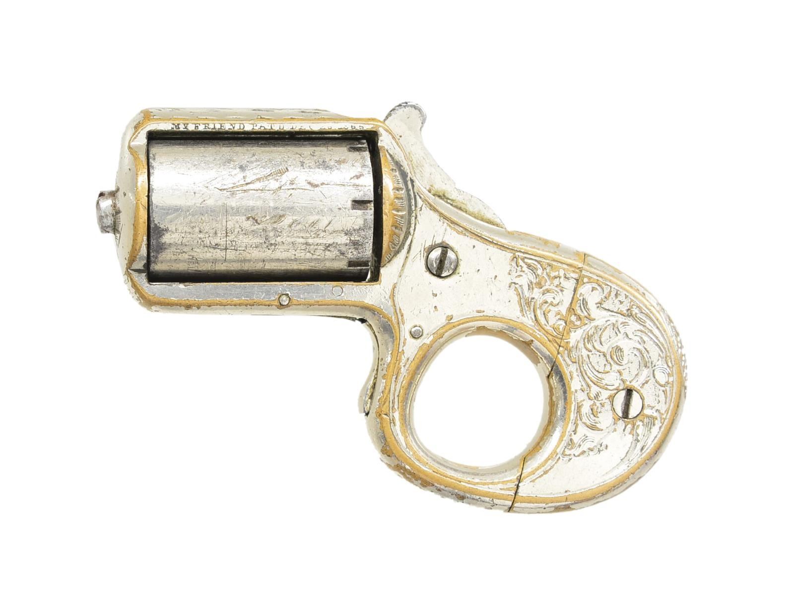 Cal. 22 RF. S# 11022. 1 7/16" Seven shot rnd. cyl. Brass frame doubles as a set of knuckles for hand fighting. Full nickel finish w/ scroll engraving. Left side of frame above cyl. marked "MY FRIEND". Estimated quantity of 10,698 mfg. 1868-1882. CONDITION: 60% nickel finish. Cyl. shows numerous sm. dents. Cyl. does not rotate properly when action is cycled. Dark lightly pitted bores. (01-20045/DS). ANTIQUE. $600-900.