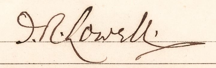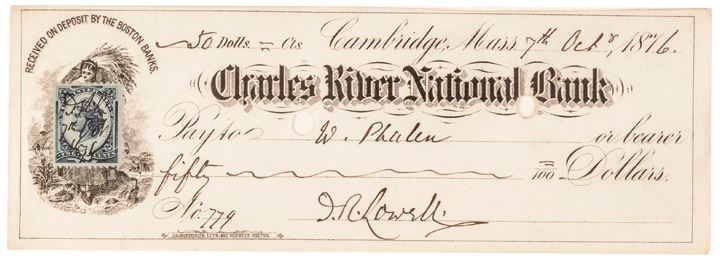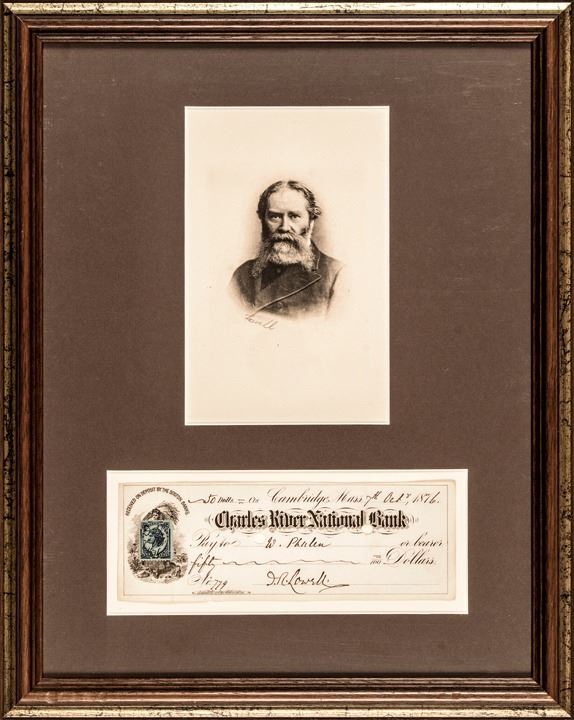October 7, 1876-Dated, Partially-Printed Document Signed, “J.R. Lowell,” measuring 8” x 2.75”, Choice Very Fine. Check is Engrossed and Signed by Lowell, drawn on Charles River National Bank, Cambridge, Mass., cancelled, payable to W. Phalen in the amount of $50. A blue 2¢ Internal Revenue stamp is affixed at left, initialed and dated by Lowell. Accompanied by an engraved portrait print of Lowell, professionally matted and framed together in modern wood frame, 13.5” x 17” and ready to hang on display.