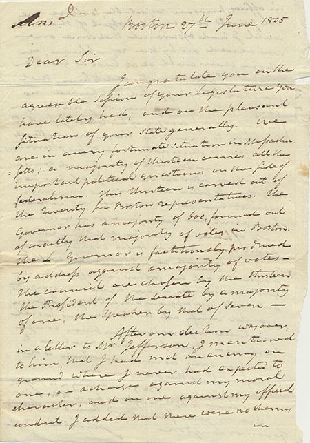 (1744 - 1808) American Revolutionary, a member of the Massachusetts Committee of Safety who later pressed for adoption of the Constitution. Fine political content A.L.S. 2pp. 4to., Boston, June 27, 1805 to Governor John Langdon of New Hampshire discussing the machinations of the Federalists, then in control of Massachusetts. "I congratulate you on the agreeable session of your legislature you have lately had and on the pleasant situation of your state generally. We are in a very fortunate situation in Massachusetts. A majority of thirteen carries all the important political questions on the side of Federalism. This thirteen is carved out of the twenty for Boston representatives. The governor has a majority of 600, formed out of exactly that majority of votes in Boston. The L[ieutenant] governor is factitiously produced[?] by address against a majority of votes -- the council are chosen by the thirteen. The President of the Senate by a majority of one. The Speaker by that of Seven-- After our election was over, in a letter to Mr. Jefferson, I mentioned to him, that I had met an enemy on ground where I never had expected to and, on a charge against my moral character, and on one against my official conduct. I added that that there were no change in offices, however, respectable to allure me. but I should remain the object of their abuse until I had assurance that someone was agreed on by the republicans, in whim there could be at least as great an union. I also mentioned to him, that they had lately suggested, that he had no confidence in me ... The tale last mentioned came from that bitter old villain Jo Blake. He is a bitter old fellow, and had no complaint against me besides my having called on him about five years since for an indisputable note of hand - but his assertions gain credit from his son's being district attorney and a pretended republican. He will try hard to get his father into office in the custom house where a vacancy is expected, but such an appointment by Mr. Jefferson would verify all his slanders and would essentially insure the republican cause with us-- but i did not include to make any communication to the president of the occasion..." Langdon had just recently been re-elected to the New Hampshire governorship in June 1805 after being ousted by Sullivan's Federalist brother, John Sullivan in 1789. James Sullivan would be elected governor in 1807, but would only serve a year before dying in office. With integral transmittal leaf addressed in Sullivan's hand bearing a red "BOSTON Ms JUN 28" cancellation. Some marginal wear, usual folds, else fine.