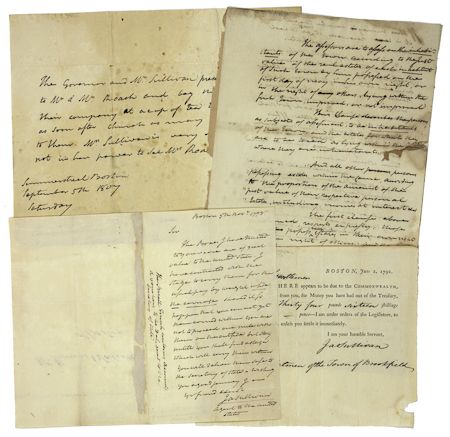 (1744 - 1808) American Revolutionary, a member of the Massachusetts Committee of Safety who later pressed for adoption of the Constitution. A.L.S. 1p. 8vo., Boston Nov. 5, 1798 to Thomas Wolcott, in part, "...The Boxes I have trusted to our care are of great value to the United States. I have contracted with the stage to carry them for the usual way...should it so happen that you can not get them carried within you are not to proceed one mile with them on the outside but stay untill [sic] you shall find a stage which will carry them within. You will deliver them safe to the Secretary of State...". A marginal note in Sullivan's hands reveals that the parcel was "The small Trunk containing accounts & vouchers to be delivered to the Secretary of State". Offered with an A.L.S. in the third person "The Governor and Mrs Sullivan", 1p. oblong 4to., Boston 5 Sept., 1807 inviting "Mr. & Mrs. Roach" for "a cup of tea tomorrow evening as soon after the church as may be agreeable to them...". Also together with an A.D.S. 2pp. legal folio, [Boston], 17 Oct. 1801, a long essay concerning the levy of property taxes as well as a partly-printed D.S. 1p. oblong 8vo., Boston 2 June 1792 notifying the selectmen of Brookfield, Mass., of a tax debt still owed to the commonwealth. Together four pieces in very good condition.
