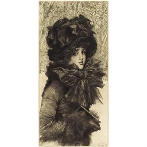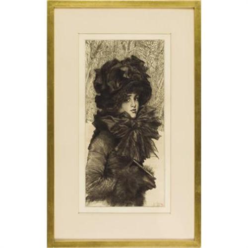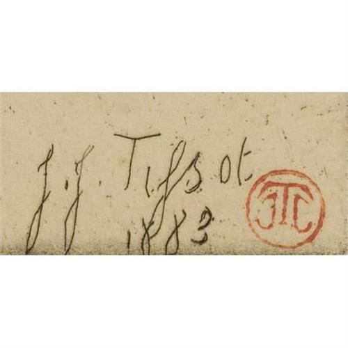<B>JAMES JACQUES TISSOT (French, 1836-1902)</B></I><BR><I>Sunday Morning</B></I>, 1883<BR>Drypoint etching<BR>15-1/2 x 7-1/2 inches (39.4 x 19.1 cm)<BR>Signed in pencil lower left: <I>J Tissot</B></I><BR>Signed, dated, and stamped in plate lower left: <I>J.J. Tissot / 1883</B></I><BR> <BR>PROVENANCE:<BR>Albert Roullier Art Galleries, Chicago (label verso).<BR><BR>LITERATURE:<BR>M. Wentworth, <I>James Tissot: A Catalogue Raisonne of his Prints, </B></I>The Minneapolis Institute of Arts, 1978, no. 72, p. 278-79, illus.<BR><BR>This etching is after a pastel of the same title, <I>Sunday Morning</B></I>, that was exhibited a the Palais de l'Industrie, 1883, no. 16, and its location today is unknown.<B>Condition Report:</B> Full margins, paper has been adhered to mat, slight toning, burned in the corners due to old mat, otherwise good condition. <BR><BR><b>Shipping:</b> Requires 3rd Party Shipping (<a target="_blank" href="http://www.heritageauctions.com/common/shipping.php">view shipping information</a>)