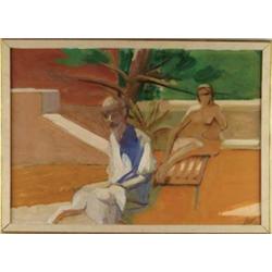 Lot # 219 JAMES WEEKS (Darrell Northrup) (American, 1922-1998) STUDY FOR BALCONY PAINTING (Two People with Dog). Acrylic on paper mounted on board scene shows a nude woman seated in chair next to man with blue and white shirt. Initial signed lower right âJW 68â. Felix Landau Gallery Los Angeles, CA label with artist and title affixed to back. SIZE: 25â x 35â. CONDITION: Very good. 9-98392 (1,500-2,500)