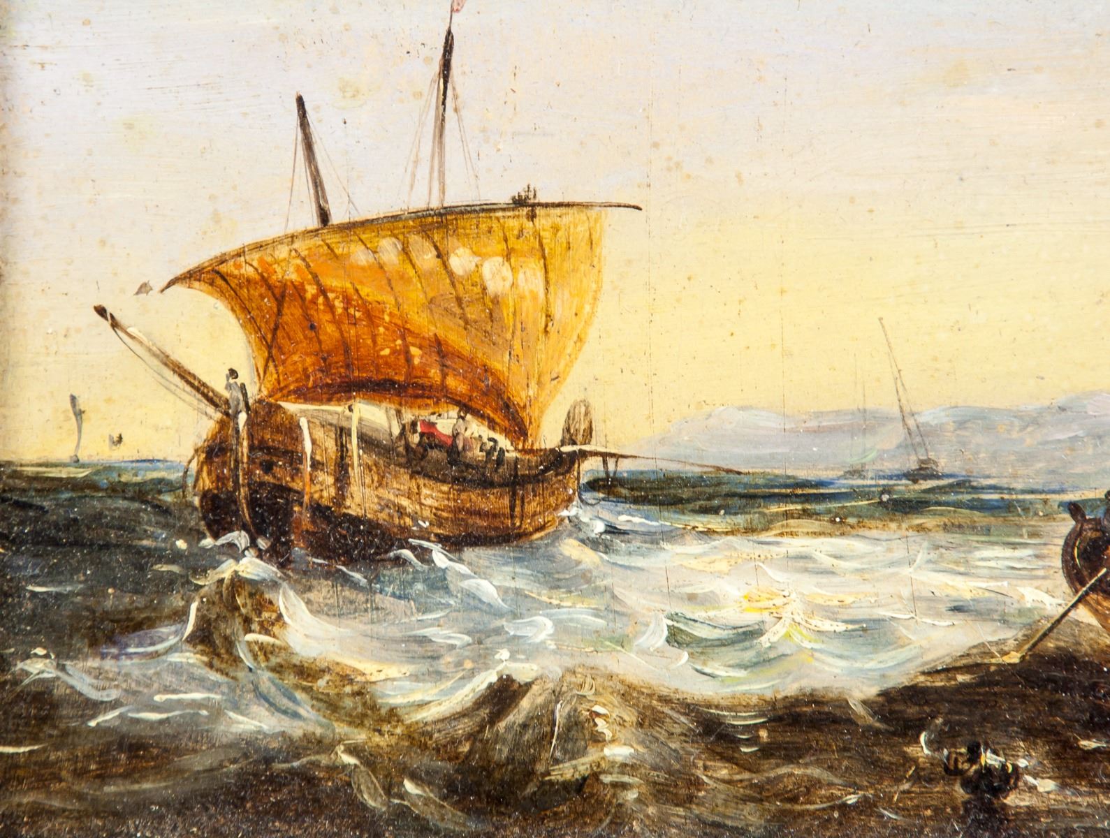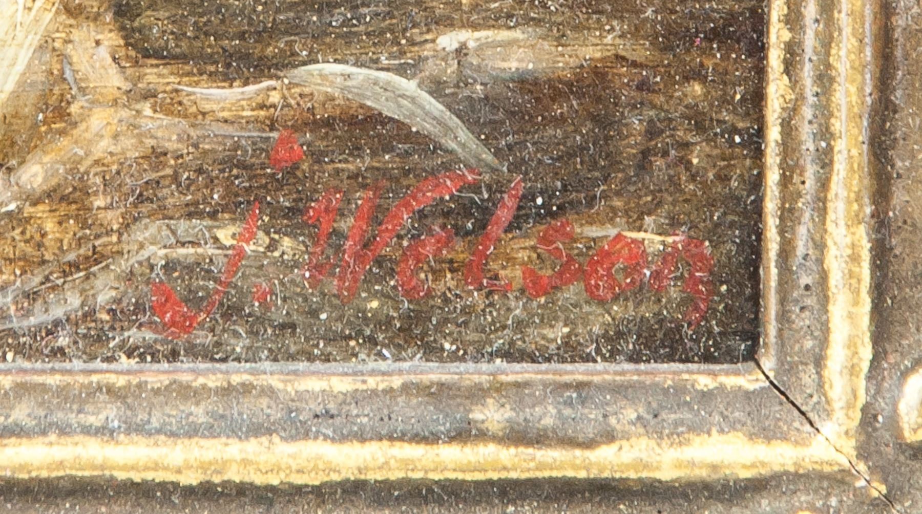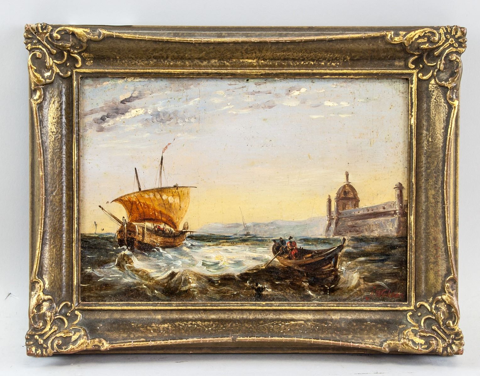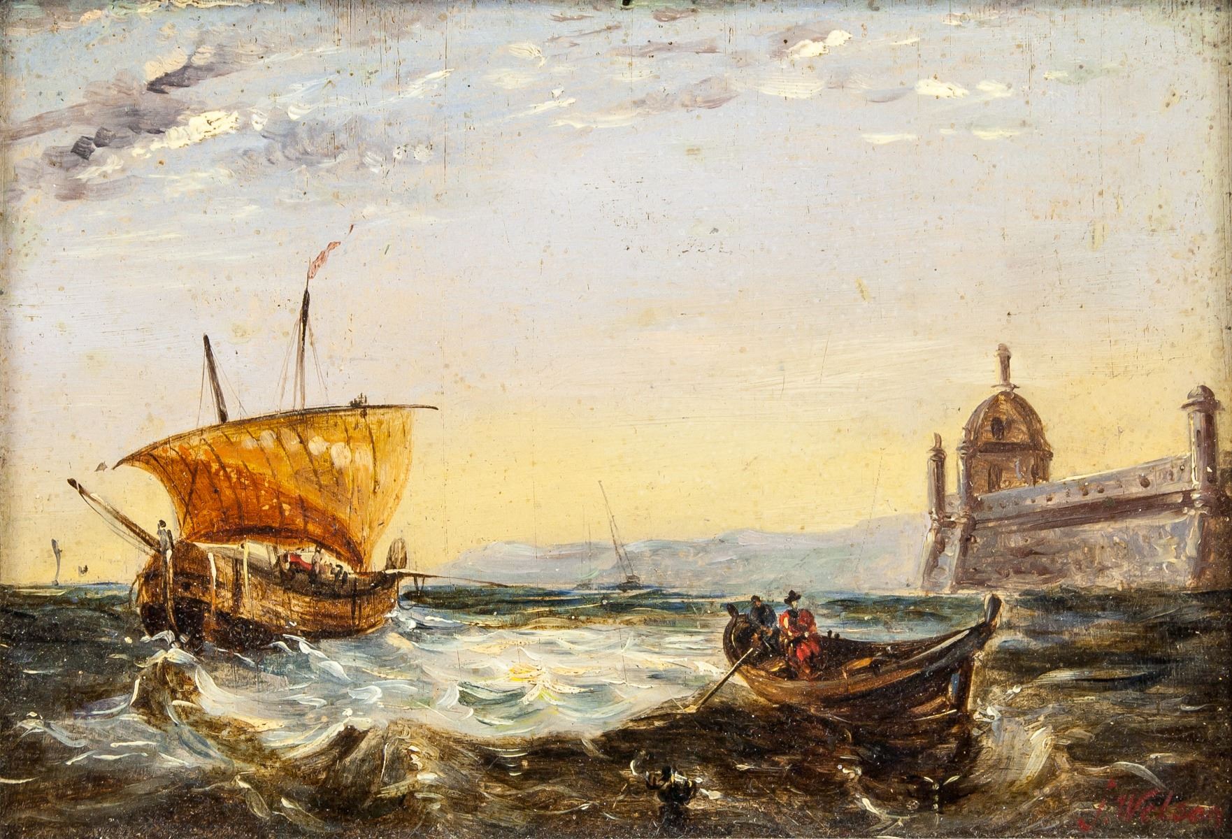 Oil on panel, framed. Featuring a boat at harborfront. Signed and attr. James Wilson John (British, 1818-1875) on the lower right corner. 15.5 x 22 cm (6 x 8.6 inches). John James Wilson was a British painter who was born in 1818. Many works by the artist have been sold at auction, including 'Figures before a cottage, near Hemingstone' sold at Christie's South Kensington 'British and Victorian Pictures' in 2003 for $7,536. The artist died in 1875.