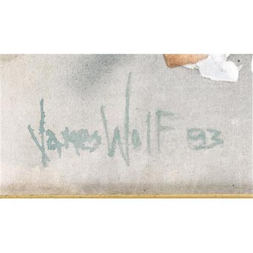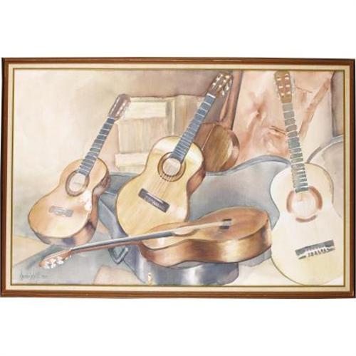 <B>James Wolf<BR></B></I><I>Four Guitars</B></I>, 1983<BR>Acrylic on canvas<BR>42 x 62 inches (16.54 x 24.41 cm)<BR>Signed and dated on lower left<BR><BR><BR><BR><b>Shipping:</b> Requires 3rd Party Shipping (<a target="_blank" href="http://www.heritageauctions.com/common/shipping.php">view shipping information</a>)