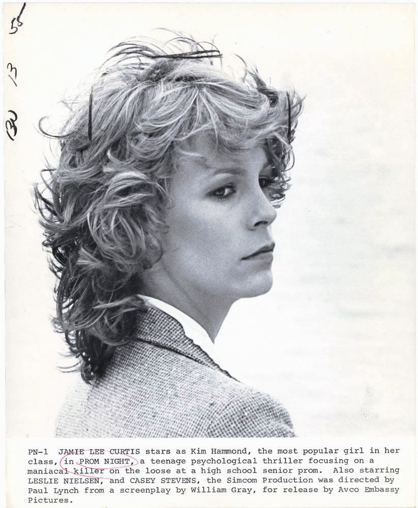 This is a vintage 1980 photograph of Jamie Lee Curtis in the movie Prom Night. SIZE: 8" x 10". "Tonight, someone has come to the prom alone. Someone who watches in the silent corridors. Someone who waits until no one can help."