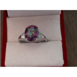 RING - 3.6CT OVAL FACETTED PINK PURPLE GREEN MYSTIC TOPAZ & 2 ROUND FACETTED ACCENT SHOULDER DIAMONDS IN STAMPED 925 STERLING SILVER SETTING - P...