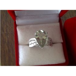 RING - 4.53CT PEAR FACETTED LIVELY GREEN YELLOW AMETHYST & 2 ROUND FACETTED ACCENT SHOULDER DIAMONDS IN STAMPED 925 STERLING SILVER SETTING WIT...