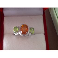 RING - 2.5 CT OVAL FACETED RICH DEEP ORANGE AZOTIC MYSTIC GEMSTONE & 2 OVAL FACETED SHOULDER MOSS GREEN PERIDOTS & 2 WHITE DIAMONDS SET ABOV...