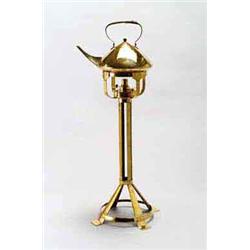JAN EISENLÖFFEL Teekessel auf Standstövchen, Messing. Dezentes Linienrelief. Schaft aus vier bandförmigen Metallstreifen, die im unteren Drittel ausschwingen und in flachen Füßen enden, von zwei Ringen zusammengehalten. Die Fassung für den Rechaud und die Auflage für den Kessel aus vier Metallbändern, die einen Ring halten. Der Kessel auf rundem eingezogenem Stand weit ausschwingend, nach oben flach konisch zulaufend; mit angesetztem Rohrausguss mit dreieckigem Grundriss, der bewegliche Henkel mit Bastumwicklung, der Deckel mit kugeligem Holzknauf. Bastumwicklung besch. H.:22 cm (Kessel), 66,5 cm (Ständer). Bez.: Werkstattmarken. Kessel um 1900, Ständer um 1903 Lit.: Krekel-Aalberse, A., Raassen-Kruimel, E., Jan Eisenlöffel, 1876-1957, Ausst.kat. Singer Museum, Laren, u.a. 1996, Abb. 122, 144, S. 152, 176 (Varianten)