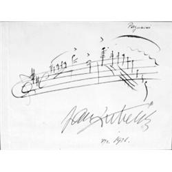 JAN KUBELIK: (1878 - 1967) Czech violinist and composer. Fine association A.M.Q.S. 1p. 8vo., [n.p.], Mar. 7, 1921, two measures of music titled "Paganini", being a composition of pioneering violinist Nicolo Paganini, boldly penned on a cream sheet and signed beneath. Beautifully matted in pink with red accents and set, with a vintage photograph showing the youthful Kubelik with violin, into a gilt frame. In very good condition, unexamined out of frame. $100-150