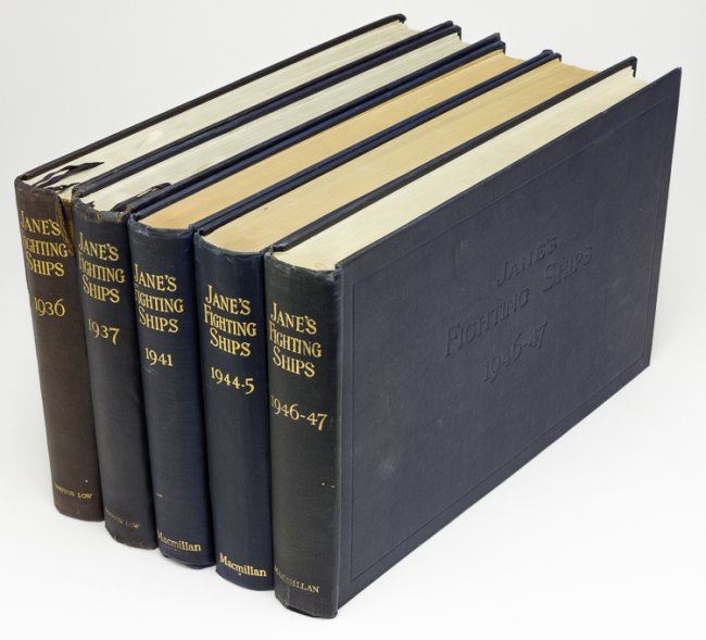 Collection of five volumes of "Jane's Fighting Ships", the authoritative compilation of photographs, statistics, armaments, etc. of all military vessels in national fleets worldwide. Each 13" x 8 1/2" volume is bound in blue cloth, printed by Sampson Low, London. Included in the groups are the editions for the years 1936, 1937, 1941, 1944-45, and 1946 which show the build-up and decimation of the various Allied and Axis fleets during the course of the war. Overall fine condition, and excellent reference material.