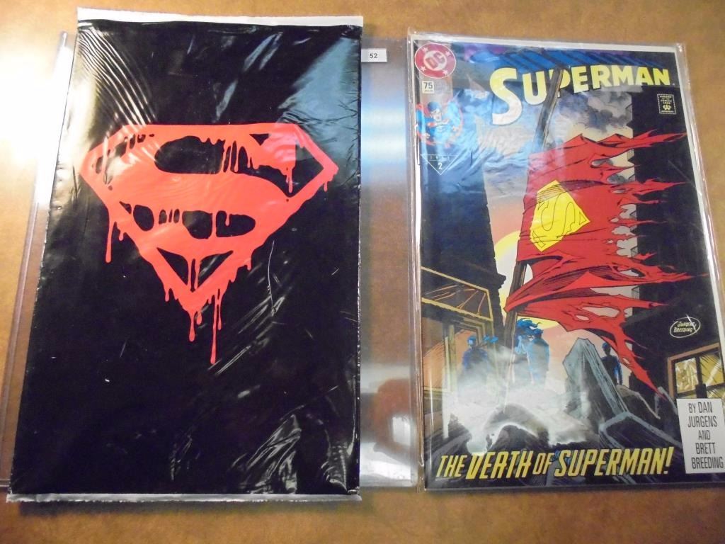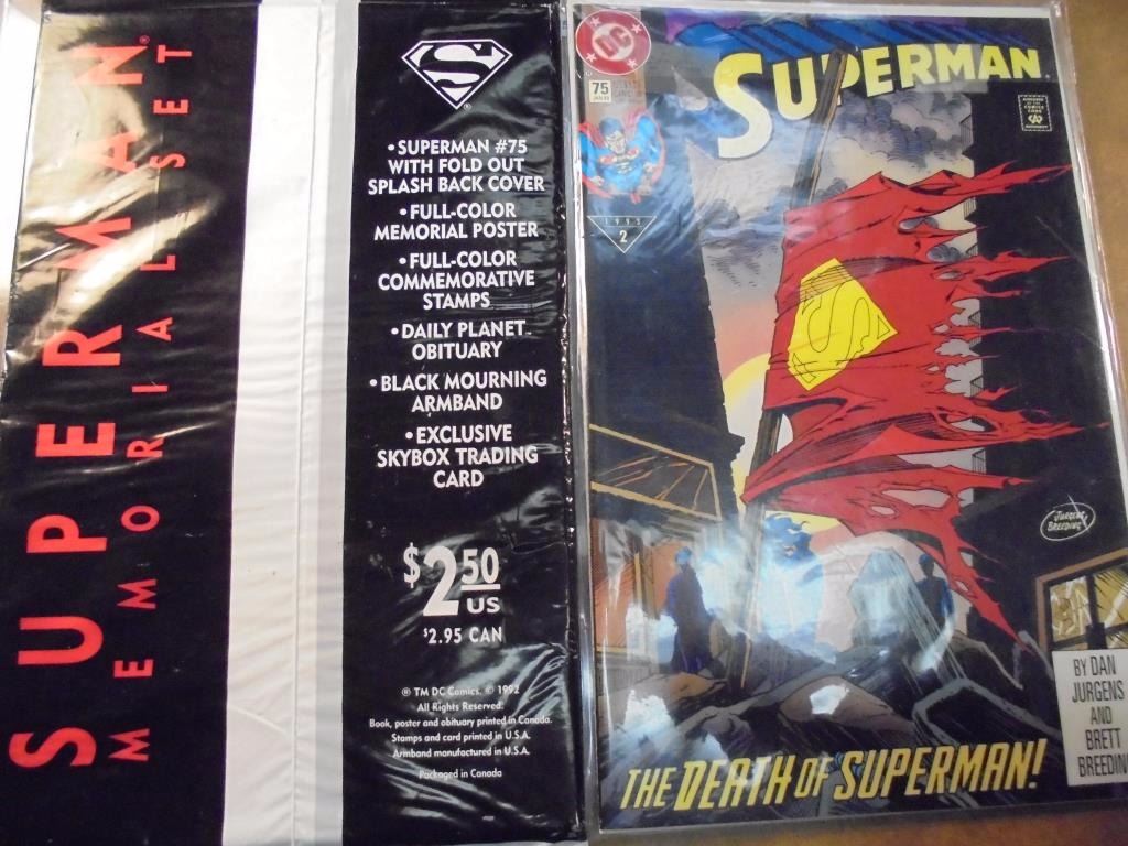 SUPERMAN #75, FULL COLOR MEMORIAL POSTER, COMMEMORATIVE STAMPS, DAILY PLANET OBITUARY, BLACK MOURNING ARM BAND AND EXCLUSIVE SKY BOX TRADING CARD.
