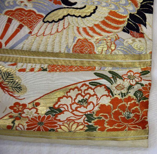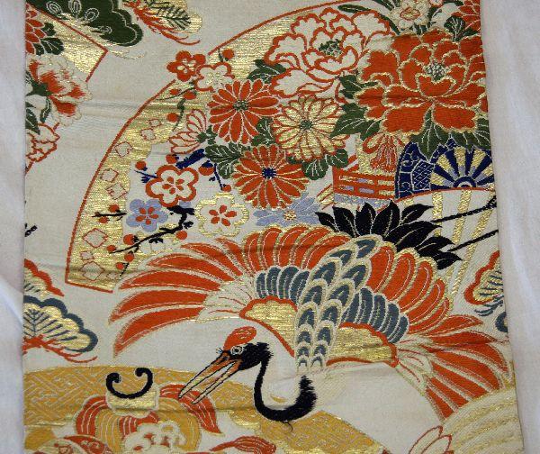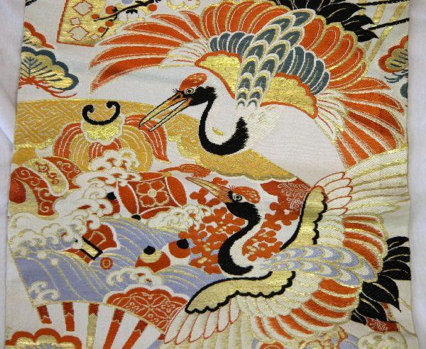 13 foot gilded embroidered silk obi in very good condition with vibrant color and minimal thread breakage.