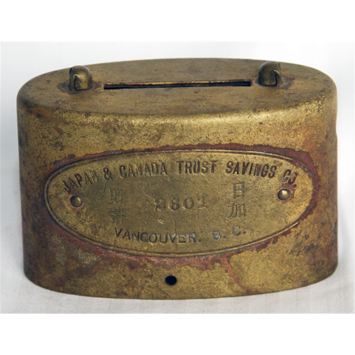 JAPAN & CANADA TRUST SAVINGS CO./VANCOUVER, BC. (and in Japanese). An oval Brass bank. Coin slot on top. No handle, key lock or patent information. 8cm x 5cm x 4cm. Maker unknown. The shell of the bank, with the bottom of the bank missing. VG.