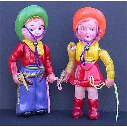 CELLULOID COWGIRL AND COWBOY, loosely strung moveable arms, each has cord on hat and rope in hand, very charming, Made in Japan, 1950?s, 4 inches tall.