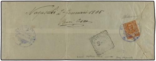 1905 (Jan 2) Cover from Nagasaki/Japan to Castelletto, Italy franked by 1901 20c. orange on reverse cancelled by "Nave Marco Polo" Italian Steamship datestamp in blue. Castelletto squared circle arrival (Feb 12). A rare and appealing cover. Scott 80.