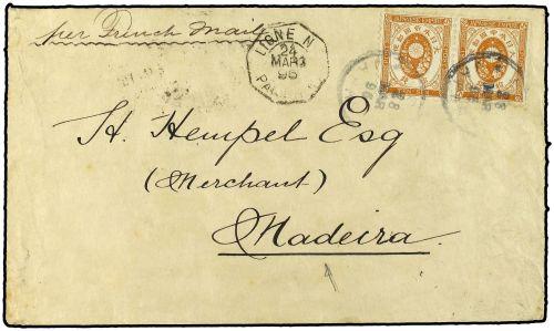 1896 (March 23) Cover from Tokio to Madeira franked by Koban 10s. brown (2) with octagonal ´Ligne N´ datestamp alongside. Reverse with Paris/Bordeaux TPO, Lisbon and Madeira arrival datestamps. An extraordinary destination for Japanese Mail at this date. Scott 79.