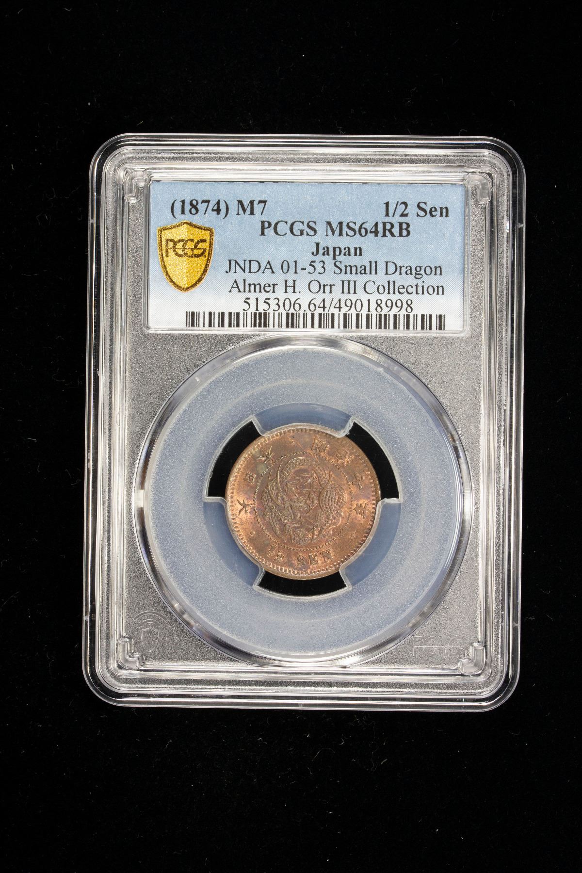 JAPAN: Meiji, 1868-1912, AE 1/2 sen, year 7 (1874), Y-16.1, JNDA 01-53, Type I dragon, lovely orange luster, PCGS graded MS64 RB, ex Almer H. Orr III Collection.