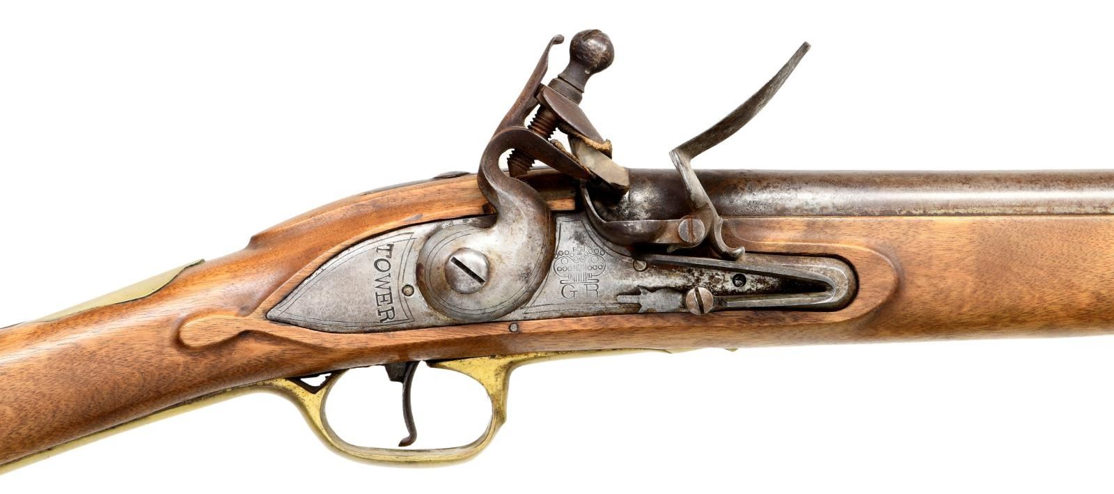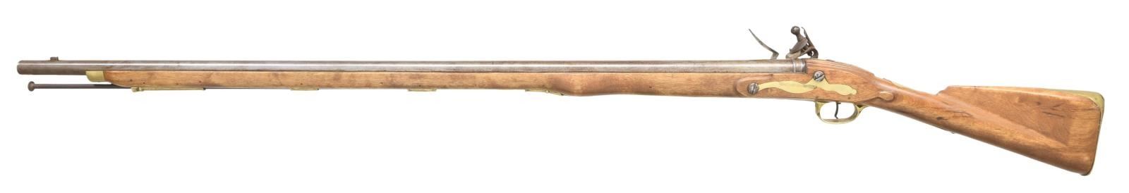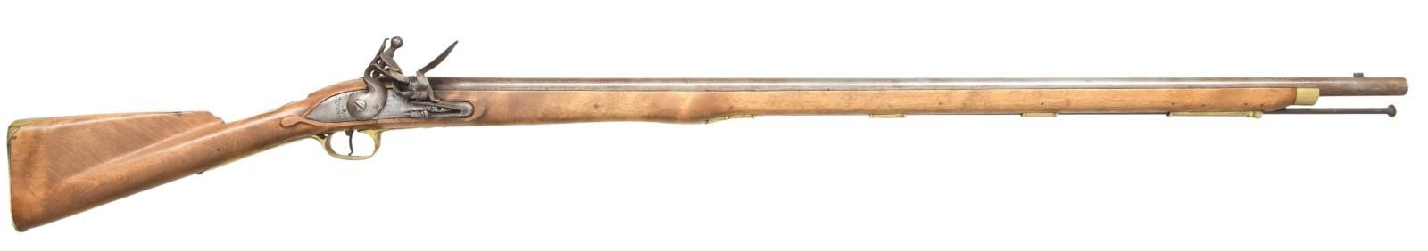 MUSKET. Cal. 75. S# 4278. Bbl. tang marked "JAPAN"; possibly mfg. by Miroku. Rnd. smoothbore 41 3/4". Stud front sight. Lock marked "TOWER" & crown "GR". Pinned musket hardwood stock w/ brass furniture & button tipped ramrod. CONDITION: bright metal finish faded to a brown patina w/ light pitting around touch hole. Very good wood finish showing light handling marks. Brass starting to acquire patina & light verdigris. Good bore showing light fouling & pitting. (01-23487/MD). $500-800.
