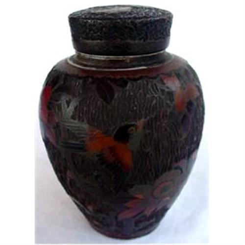 Rare Japanese tree bark cameo and cloisonne porcelain lidded jar. These were only made between <BR><BR>late 19th century to about 1910. Height 5 1/4 inches.<BR>Baluster form. Brown background, clearly handcut to look like tree bark. The surface is covered <BR><BR>with wonderfully cut flowers and birds in a range of warm tones, orange, red, yellows, ochres, <BR><BR>greens and browns. Outlines in metal wires. The lid features a pair of butterflies. A metal <BR><BR>insert that can easilly be removed, has been placed in the vase to hold the lid securely.<BR>Condition is good - no chips/cracks/losses/damage of any sort.