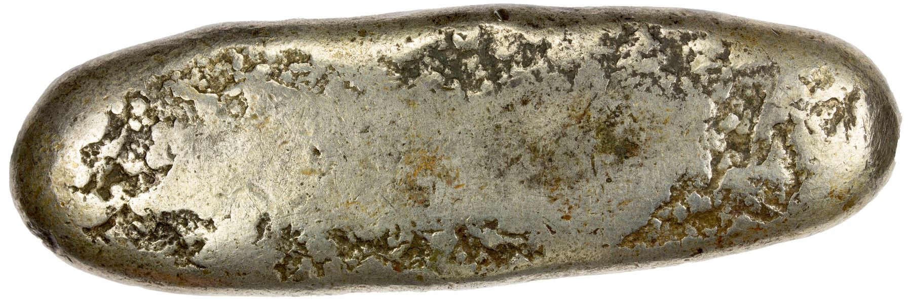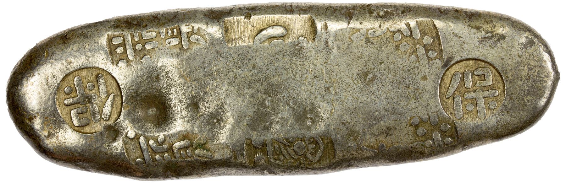 JAPAN: Tenpo, 1830-1844, AR chogin (145.07g), Edo Mint, H-9.50, Cr-9b, JNDA-09-68, with character po stamped at both ends, 0.260 fine silver, struck 1837-58, Choice VF. Cho-gin were various silver ingots shaped like a sea cucumber which did not have a face value but were a silver-by-weight standard in which the value was decided by the weight. This was the same for the various sizes of Mameita-gin as well. These types carried the Japanese-era name at the time of manufacture stamped on the coins.