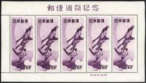1949 Postal Week 8y violet (SG 556) in sheetlet of five with full margins, folded through margin in two places, fine u/m, cat £650+
