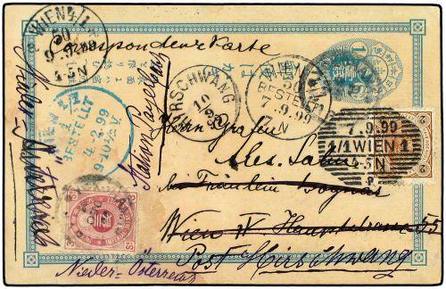 1899 YOKOHAMA a WIEN. Entero postal de 1 sen con franqueo complementario de 3 sen reexpedido a NIERCER (Austria) con sello de 2 kr. Precioso y raro franqueo mixto JAPON-AUSTRIA. Cert. HOLCOMBE.