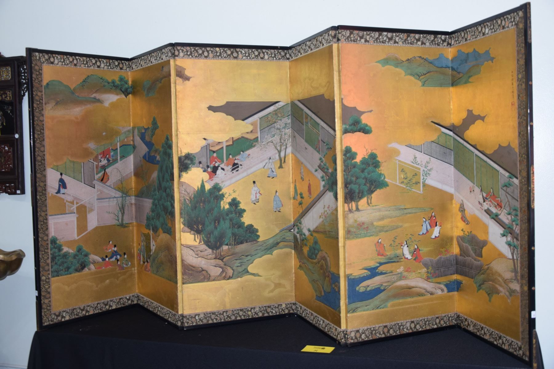 JAPANESE 6 PANEL BYOBU SCREEN, INKS & COLORS ON GOLD LEAF PAPER, TOSA SCHOOL, SPURIOUS SIGNATURE OF TOSA MITSUOKI (1617-1691), DEPICTING ARISTOCRATIC SCENES IN A PALACE, BROCADE SILK BORDER W/BLACK LACQUER FRAME, CA. 19TH CENTURY (43" X 111 1/2")