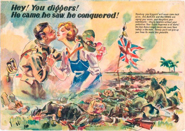 Japanese propaganda sheet dropped upon Australian soldiers and meant to demoralize them and incite hatred against their American allies. The colorful 7" x 5" flyer depicts an American soldier kissing an Australian girl, a war worker, who also wears his hat with an American flag patch. Beneth that image apperas a drawing of dozens of dead Australian soldiers on a beach, their ragged flag flapping on a broken pole. The caption reads: "Hey! You diggers! He came, he saw, he conquered! Thinking you 'diggers' will never come back alive, tha BLACKS and tha YANKS are raping your wives, your daughters, your sweethearts -- they're helpless without your protection. You future happiness is at stake! One less Aussie simply means one more Yank 'safely' in the home. Surely you'll not give up your lives to make this possible." Fine.