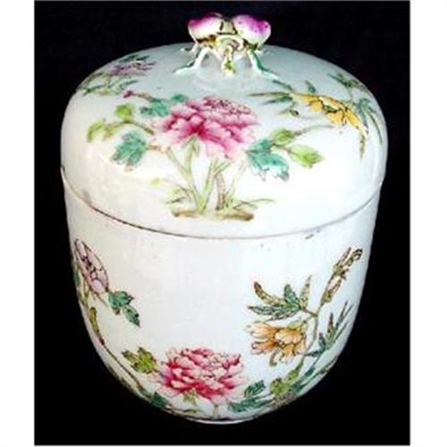 Japanese Meiji (late 19th century ) period jar and lid with double peach finial and beautiful enamel work. <P><P> Measures: 6 1/4" to top of finial. Diameter is 4 1/2". <P><P> Cylindrical shaped body. Very fine enamel work decorates both jar and lid. Colours are delicate and there is very pretty detail to the petals and leaves. The top of the lid has a wonderfully moulded double peach finial, the leaves are almost spider like in their delicacy. <P><P> Condition:overall condition is extremely good. There is one small chip on the lid and a minute one on the rim, entirely hidden by the lid. Enamel and finial are in very good shape.<P><P>