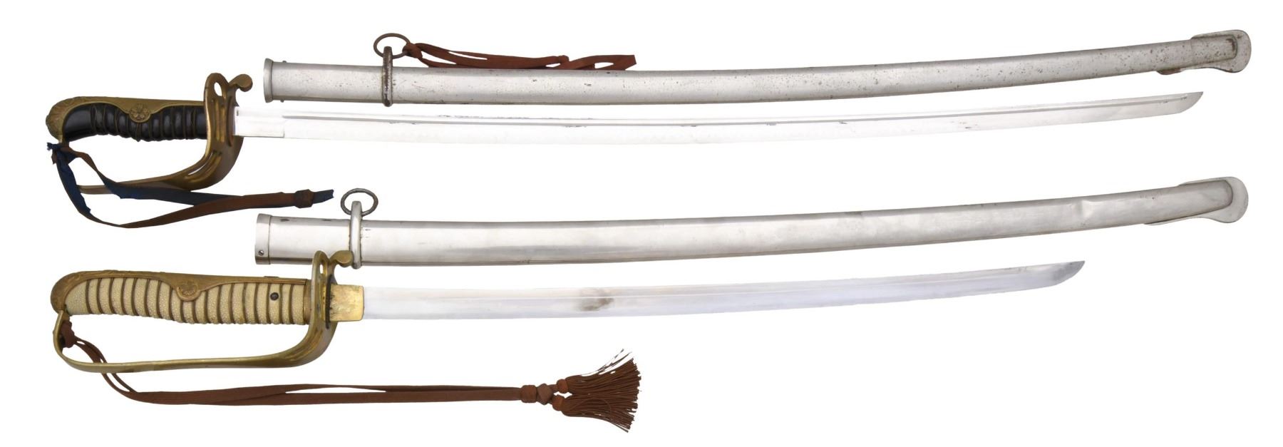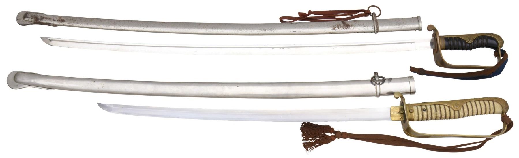 SABER. 1) KYU-GUNTO. Overall length: 39 3/4". Blade length: 23”. Blade has a straight hamon with a gold-plated brass habaki. Gilded brass tsuka in the style of Russo-Japanese mounts. The backstrap shows a 10-petal cherry blossom, denoting use by the Army. There is also a silver mon on the top of the backstrap that shows two Japanese characters. White same grip with wire wrap. There is a brown tassel attached to the knuckle bow near the pommel. Chrome-plated saya. CONDITION: blade has a good polish. Tsuka shows light wear overall, as does the saya. Tassel shows very light wear. 2) PARADE SABER. Overall length: 37 1/4". Blade length: 30 1/2". Blade has a simulated, irregular hamon. Gilded brass tsuka with a 10-petal cherry blossom on the backstrap, indicating use by the Army. Wire-wrapped, black composite grip. Partial blue/brown tassel. Plated saya. CONDITION: blade shows original factory polish. Tsuka retains only traces of original gilding but otherwise exhibits light wear. Saya has some minor loss of finish. (02-23217-3/BF). $600-900.