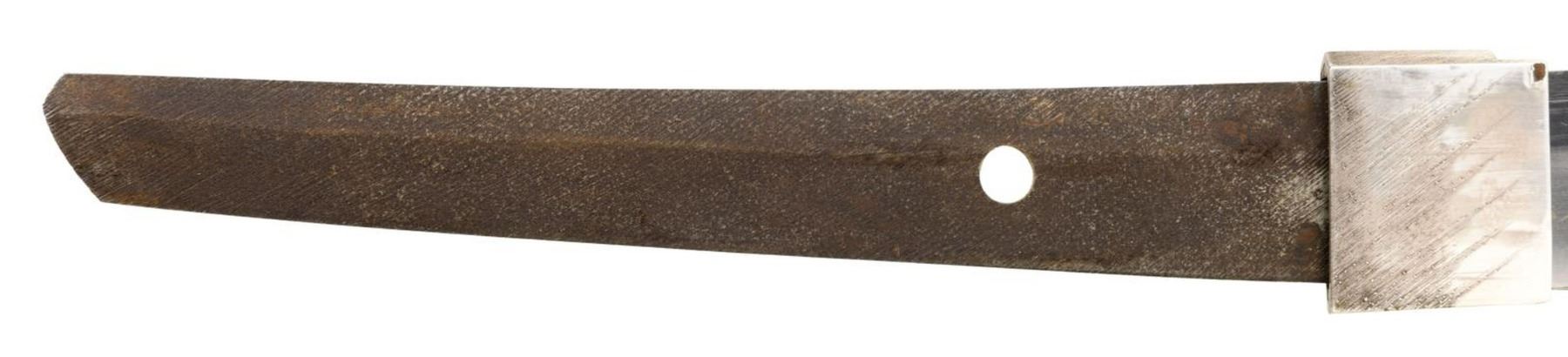 Kyu-gunto of this form were generally used from 1883 until 1945. They became popular during the Russo-Japanese War and remained in service until the close of WWII. Overall length: 37 1/4”. Blade length: 27”. Blade has a wavy hamon and a hi. The habaki is sheet silver over brass with an etched design on both sides. The nakago is unsigned and has a single mekugi-ana. The tsuka is gilded brass with white same and a gold-plated wire wrap. There is a 10-petal cherry blossom on either side of the grip and a silver seal that appears to feature a 3-lobed blossom. There are 3 seppa above & below the guard. Saya is chrome plated and covered with brown leather with a brass tip. There is a black knot attached to the guard. CONDITION: blade has a nice polish with very minor staining. Tsuka shows light wear overall, but could use a cleaning. Saya shows light wear. Leather remains solid. PROVENANCE: From the Lifelong Collection of Glen E. Mattox. (02-18413/BF). $700-1,000.