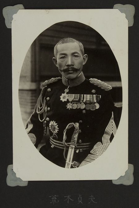 Photograph album assembled and owned by a Japanese army pilot, 7" x 9 3/4" with 92 photos in corners within. Description accompanying the album states that the album was owned by a pilot named Komatsuzaki of the Hamamatsu Bomber Squadron, likely based in the Japanese city of the same name. Many excellent images including Hirohito, Japanese generals and military officers, comrades in arms, group photos, pilots in flight gear, searchlight training, various planes in flight and on the ground including a Fokker, Aikoku 5 and "Type 87" bombers, color postcards of early Japanese fighters and bombers, a wrecked Chinese or American aircraft, and more. Many excellent aircraft images! Cover coming loose from spine, else very good.